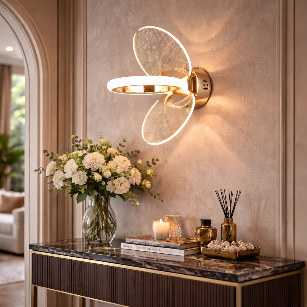 The SylvaLuxe Crystal Leaf Accent Wall Light is a sophisticated fusion of nature-inspired design and contemporary lighting technology. A polished gold arm extends elegantly from the wall mount, supporting a sculptural arrangement of radiant leaf elements crafted from crystal-textured acrylic. When illuminated, the leaves emit a warm ambient glow that enhances surrounding décor while adding depth and texture to the wall. This distinctive fixture is perfect for luxury interiors, modern apartments, and hospitality environments seeking artistic statement lighting.