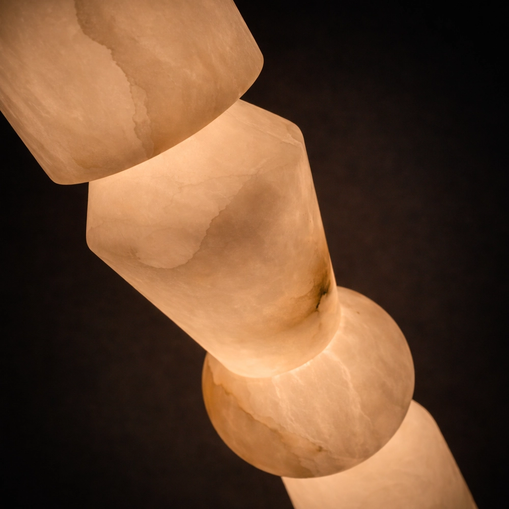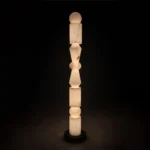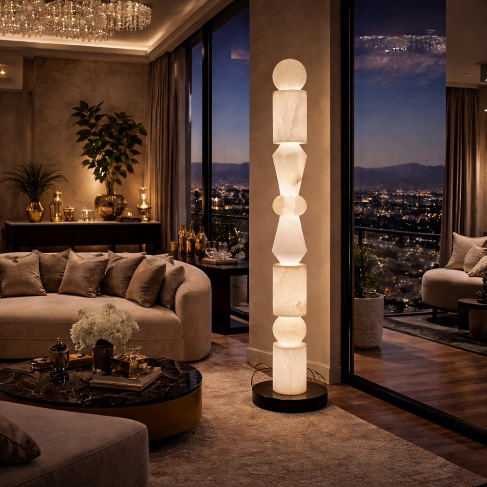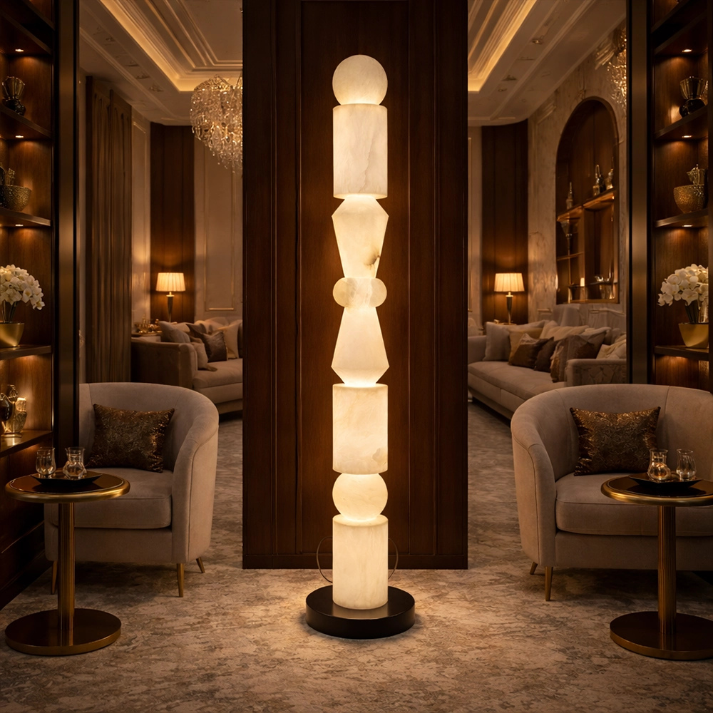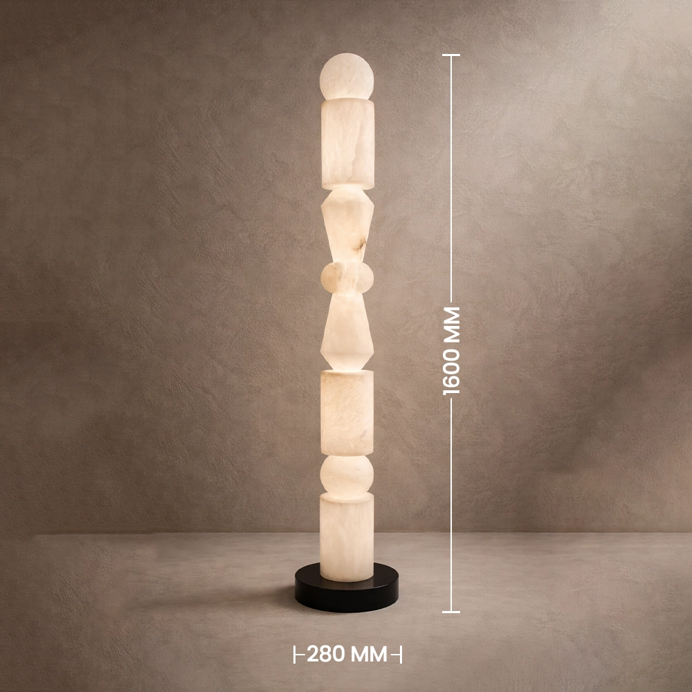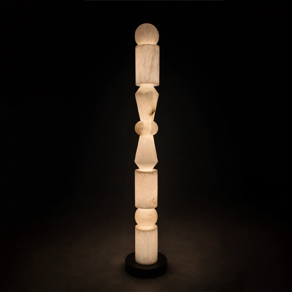 The Totema Sculptural Marble Floor Lamp is a striking artistic lighting piece inspired by stacked totem forms and modern sculptural design. Crafted from multiple carved marble elements arranged in a vertical composition, this floor lamp creates a bold architectural presence while emitting a soft, warm ambient glow through the translucent stone.