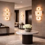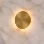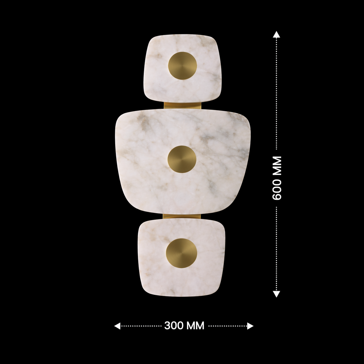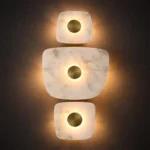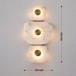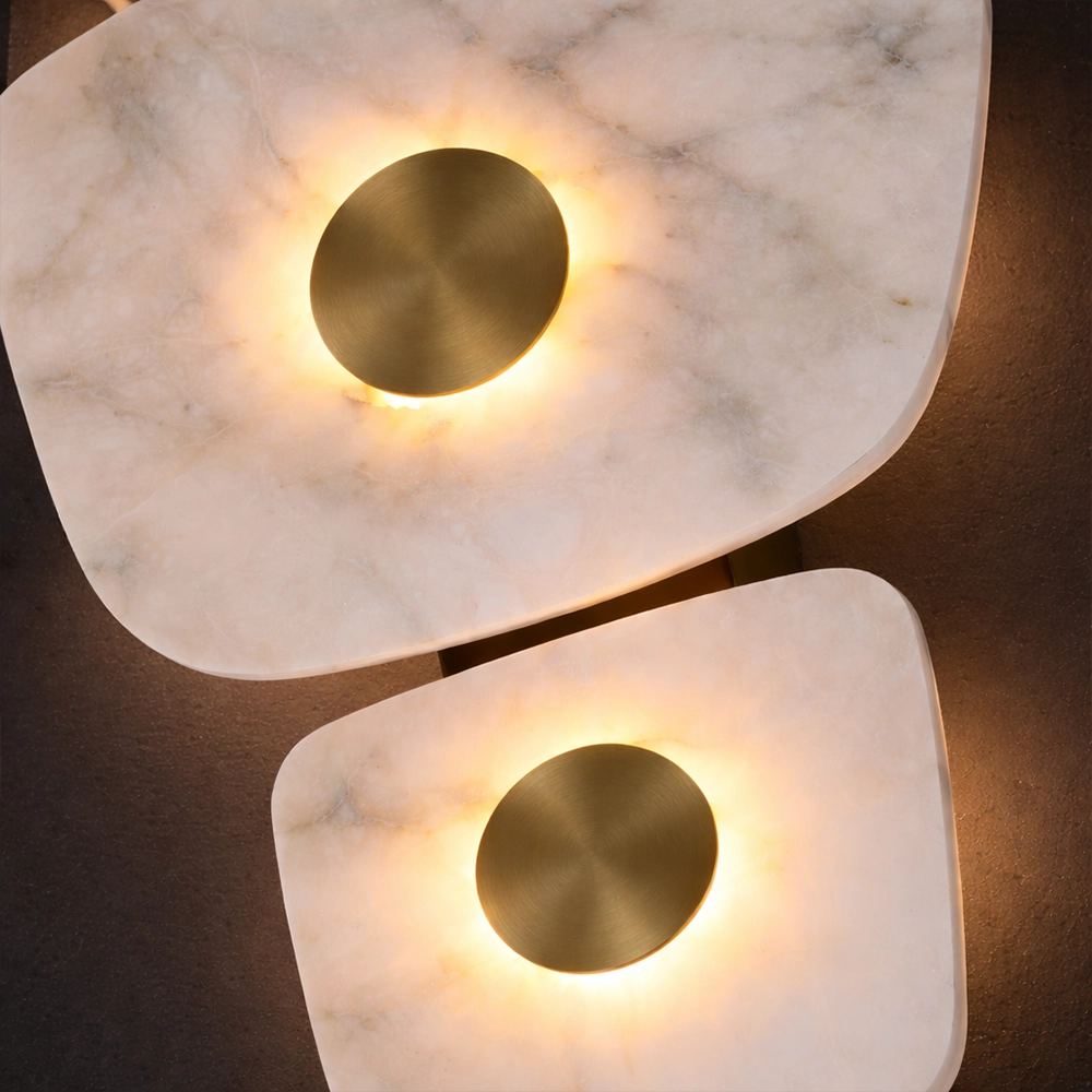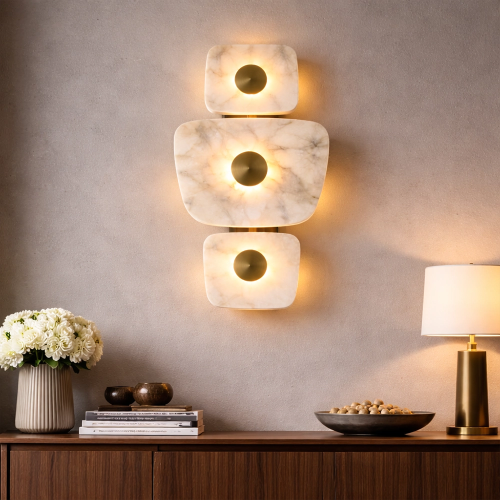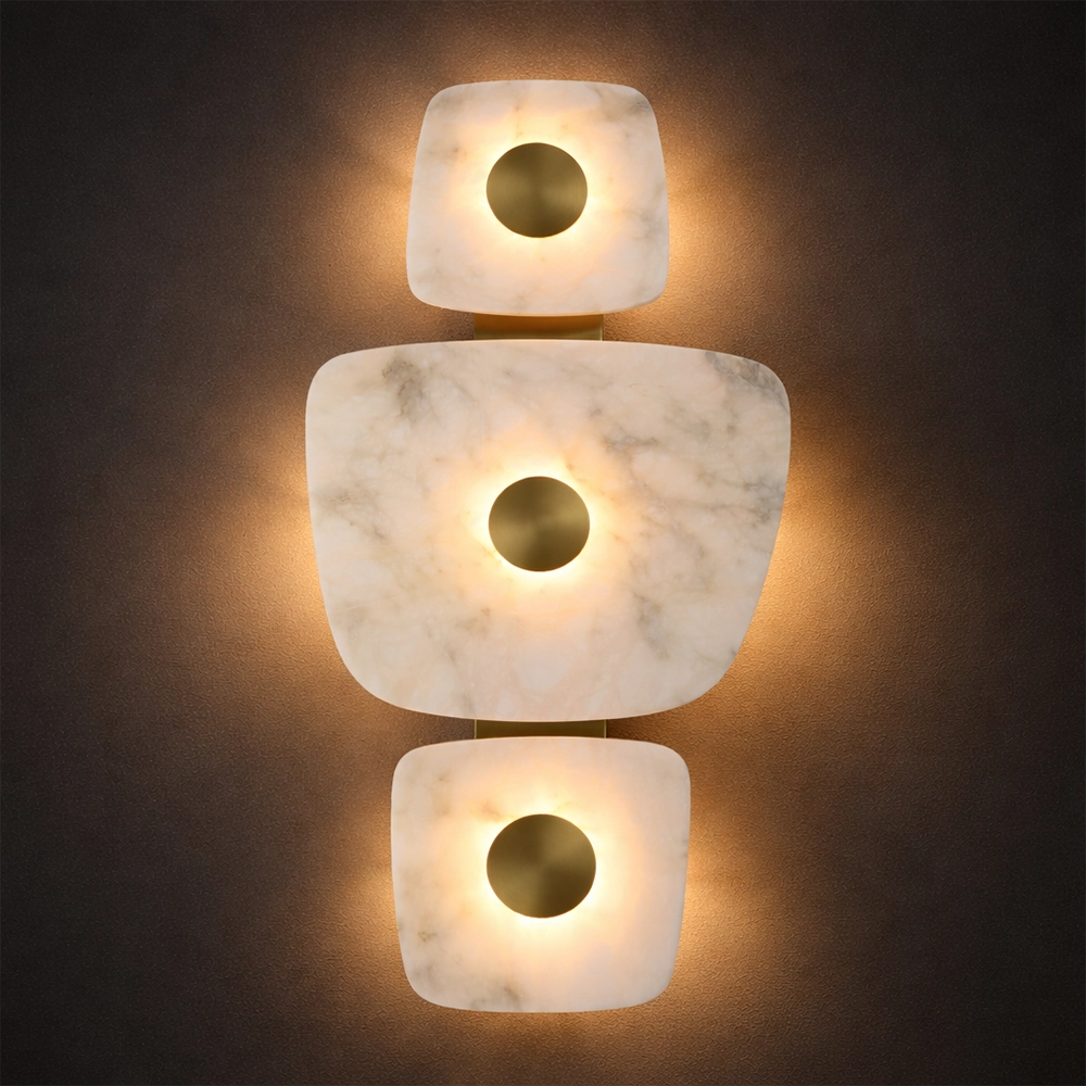 Trivona is a statement wall light featuring three sculpted marble forms aligned vertically, each centered with a brushed brass halo detail. The layered composition creates a warm backlit glow that enhances the natural veining of the stone. Ideal for feature walls, staircases, and luxury interiors that embrace architectural lighting with artistic presence.