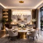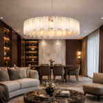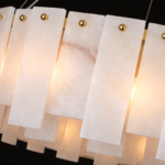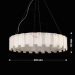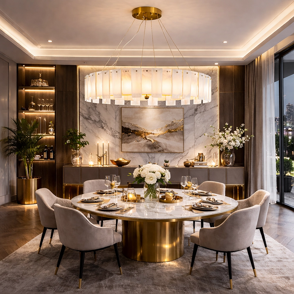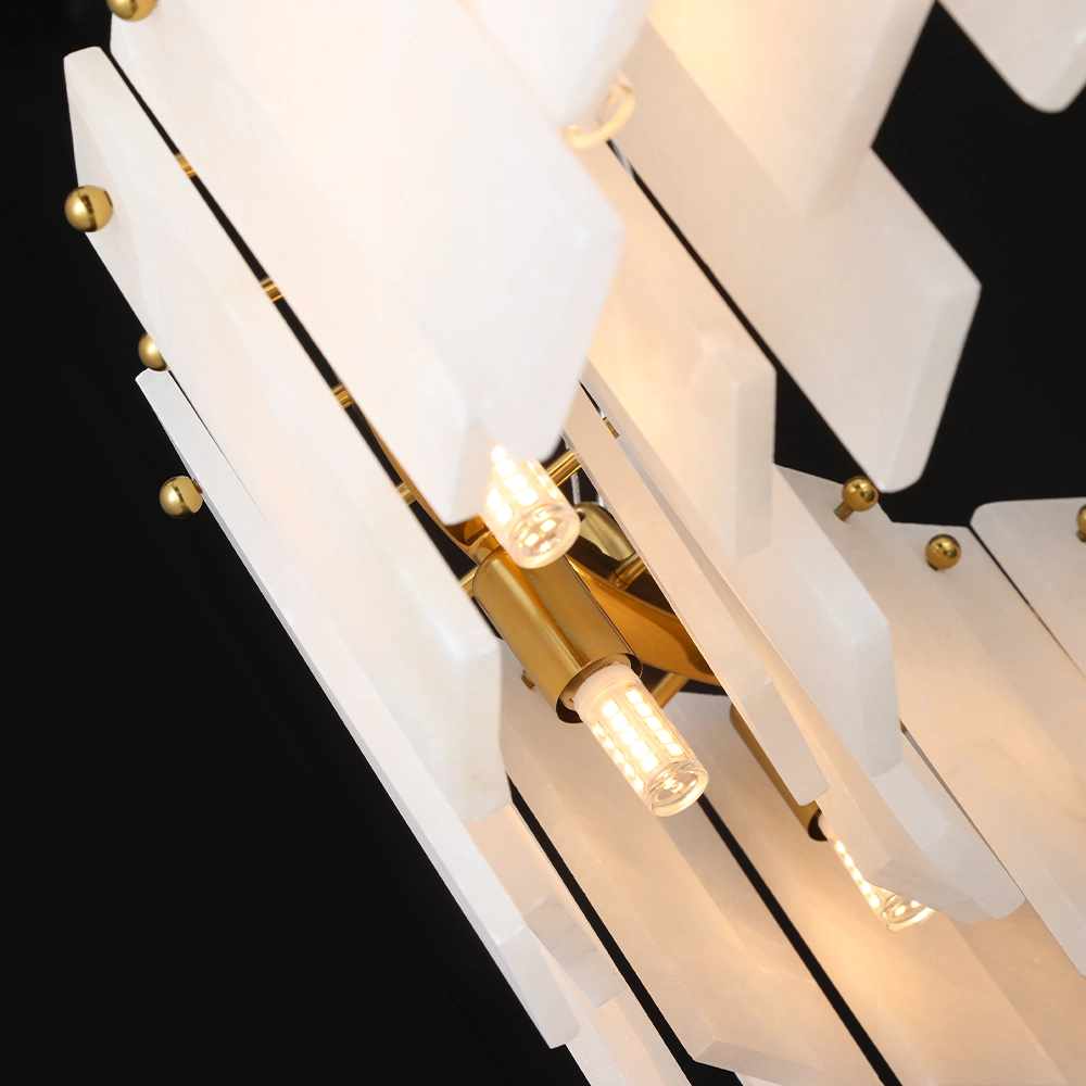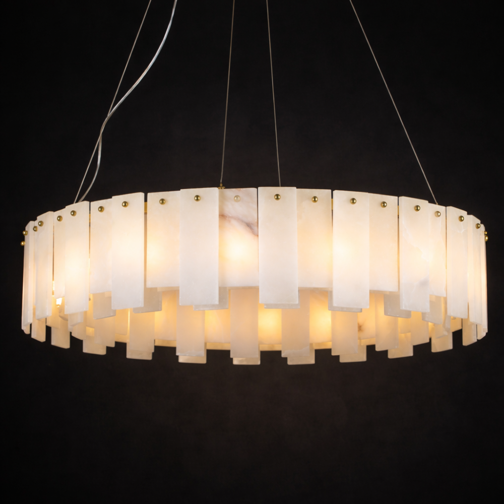 Valmere is a circular chandelier composed of staggered marble panels arranged in a layered ring formation. The natural stone softly diffuses light from within, creating a warm, dimensional glow with refined brass detailing. Ideal for dining rooms, living areas, and luxury interiors seeking statement lighting with architectural depth and material richness.