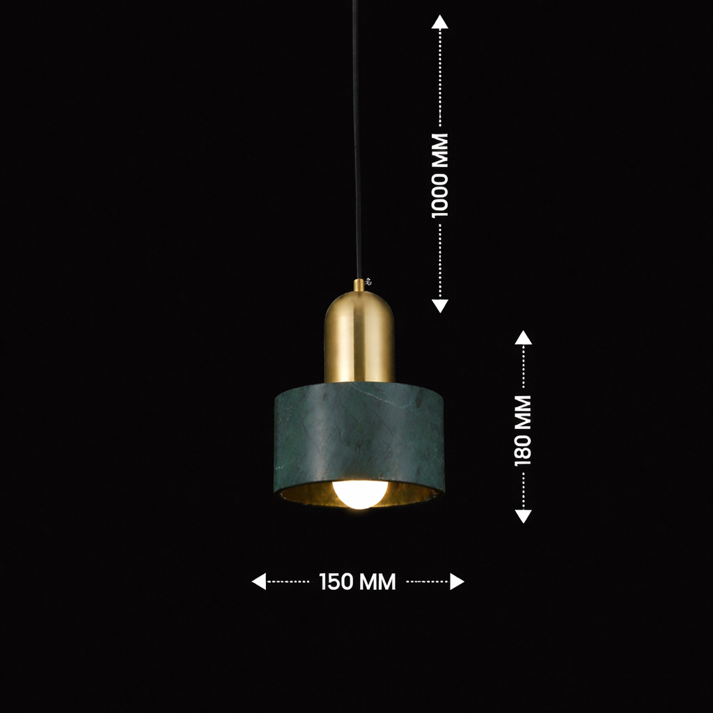 Verde Aurea is a contemporary pendant light featuring a deep green marble band paired with a brushed brass dome. The natural stone texture contrasts beautifully with the warm metallic finish, creating a focused downward glow with refined character. Ideal for kitchen islands, bedside drops, and modern interiors that celebrate material-driven design.