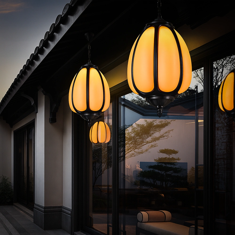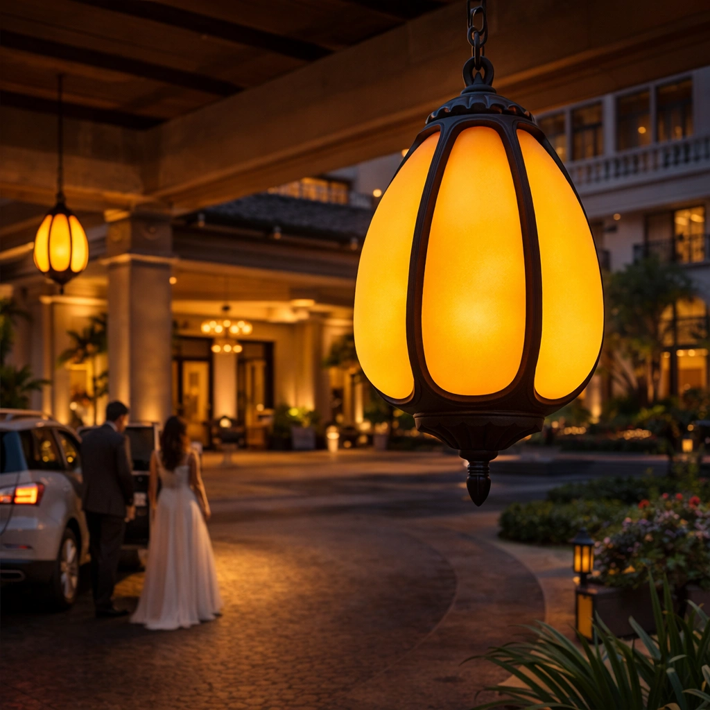 The AmberBloom Hanging Lantern Light features a petal-shaped amber diffuser framed in black metal, creating a warm, glowing focal point over balconies, pergolas, and courtyard seating. Its soft, even illumination is perfect for evening gatherings, adding a festive yet elegant touch to cafés, homestays, and villa entrances. The teardrop silhouette and chain suspension make it ideal for hanging as a single statement piece or in a row above outdoor walkways.
