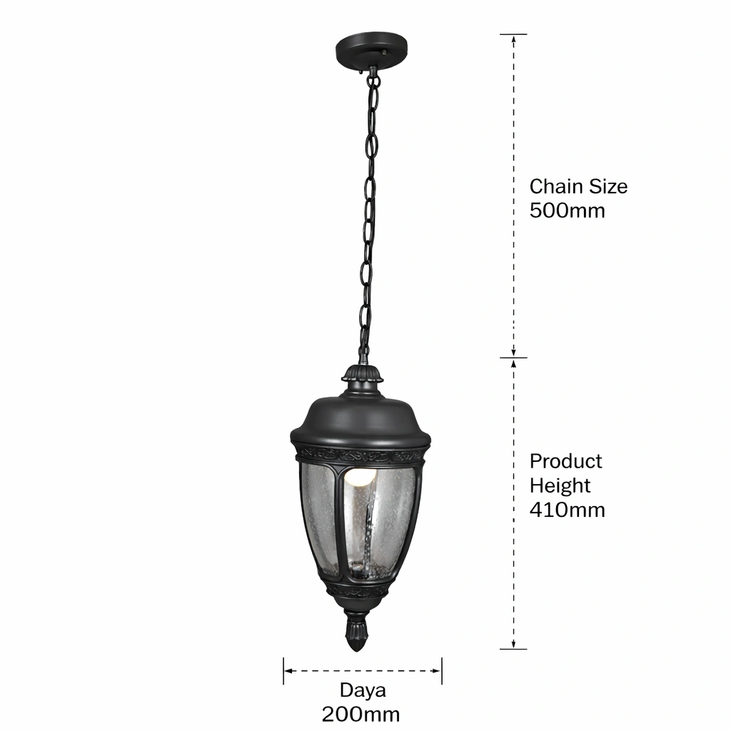 This balcony chain lantern hanging light features a black metal frame with softly textured glass panels that create a warm glow above railings and seating areas. Suspended by an adjustable chain, it is perfect for terraces, balconies, verandas, and pergolas where overhead lighting adds both ambience and visibility. The compact lantern shape works beautifully in pairs or clusters, making it ideal for residential homes, cafés, and rooftops looking to highlight their outdoor views at night.