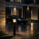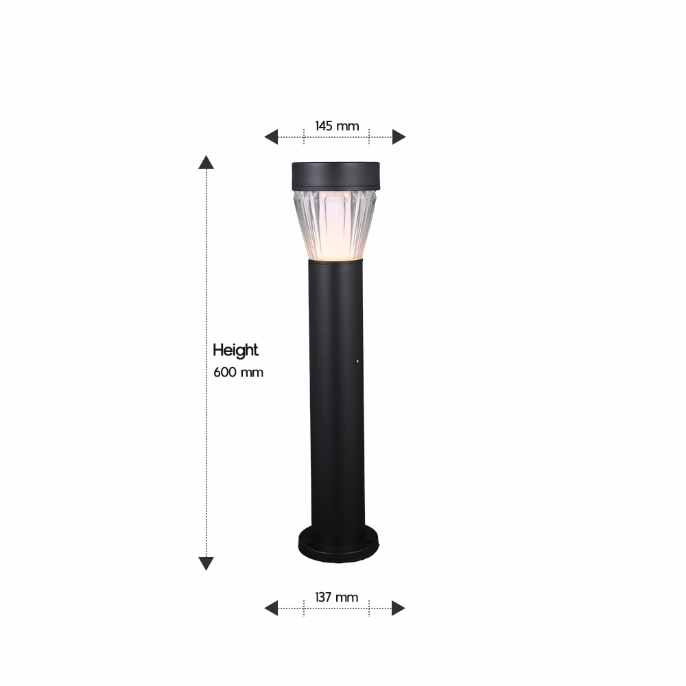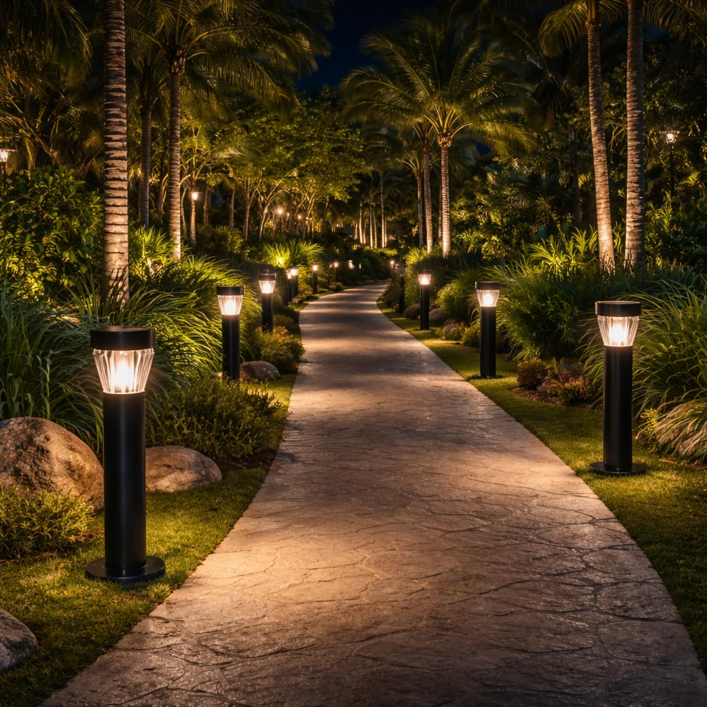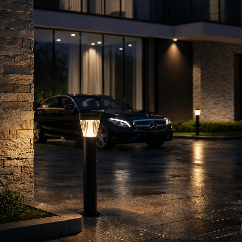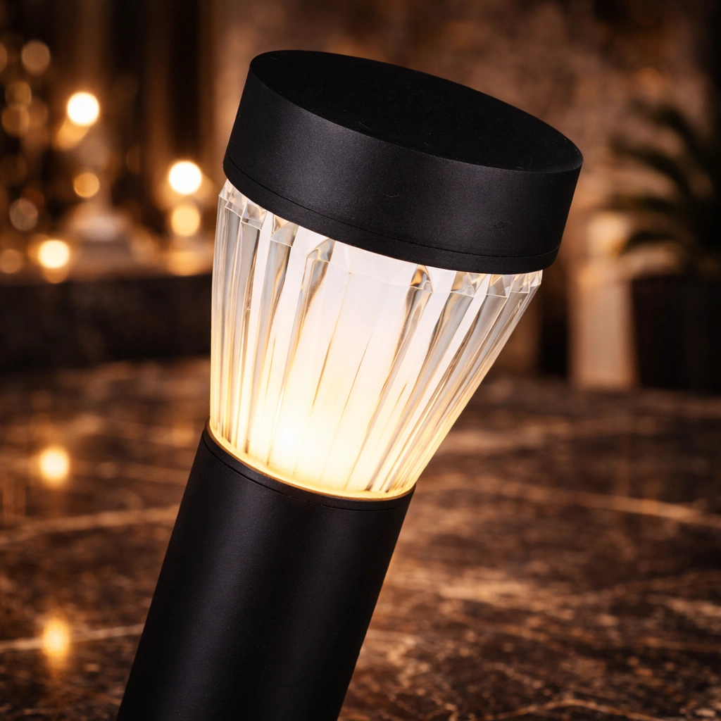 The CrestLine Stepway Bollard Garden Light features a black cylindrical body with a faceted clear diffuser that spreads crisp, radial light across steps and pathways. It is ideal for framing villa entrances, garden edges, and modern patio walkways, guiding guests safely while adding a premium architectural look. The compact height and clean geometry blend effortlessly with landscaped shrubs and hardscape elements, making it suitable for homes, resorts, and boutique hotels.