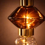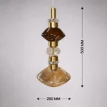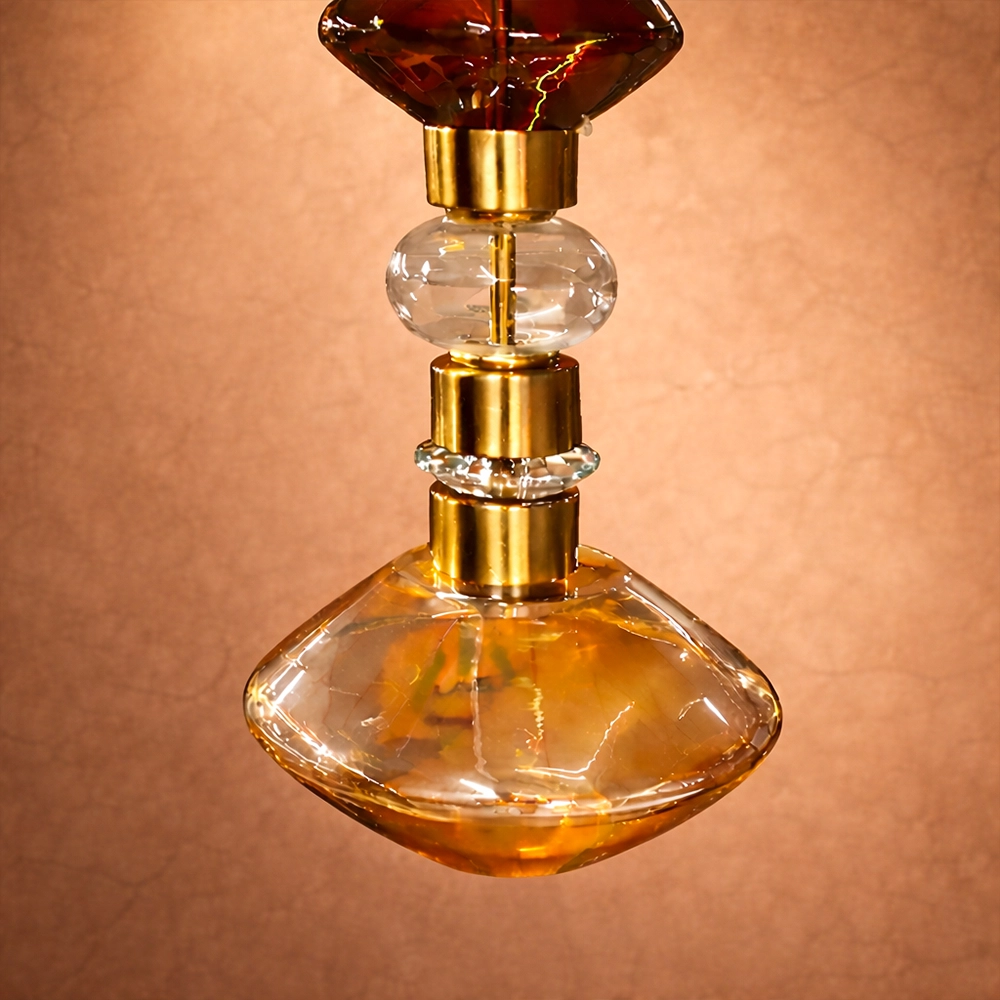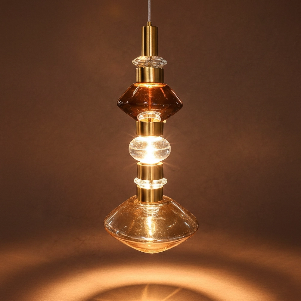The Elvarique Amber Prism Luxe Pendant is a statement glass hanging light designed to bring sculptural elegance and warm sophistication to modern interiors. Featuring layered geometric glass elements in rich amber and clear crystal tones, accented with polished gold metal detailing, this designer pendant light creates a striking vertical silhouette that doubles as functional art.