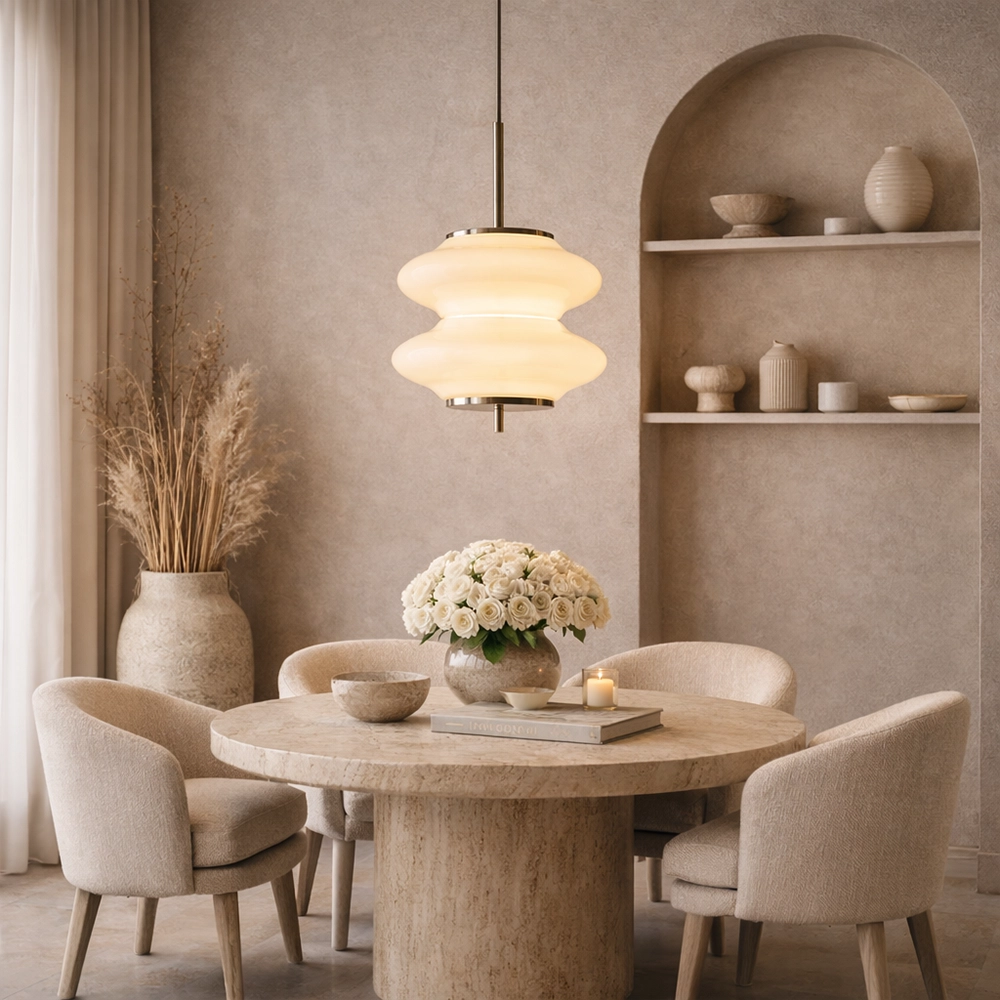 The Elvaris Lumisculpt Opal Pendant Light is a modern sculptural hanging fixture designed to bring soft ambient elegance to refined interiors. Featuring a double-contoured opal glass shade with smooth, flowing curves, this designer pendant light delivers warm, evenly diffused illumination perfect for dining rooms, bedrooms, living areas, and boutique hospitality spaces.