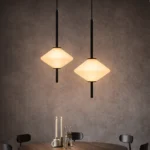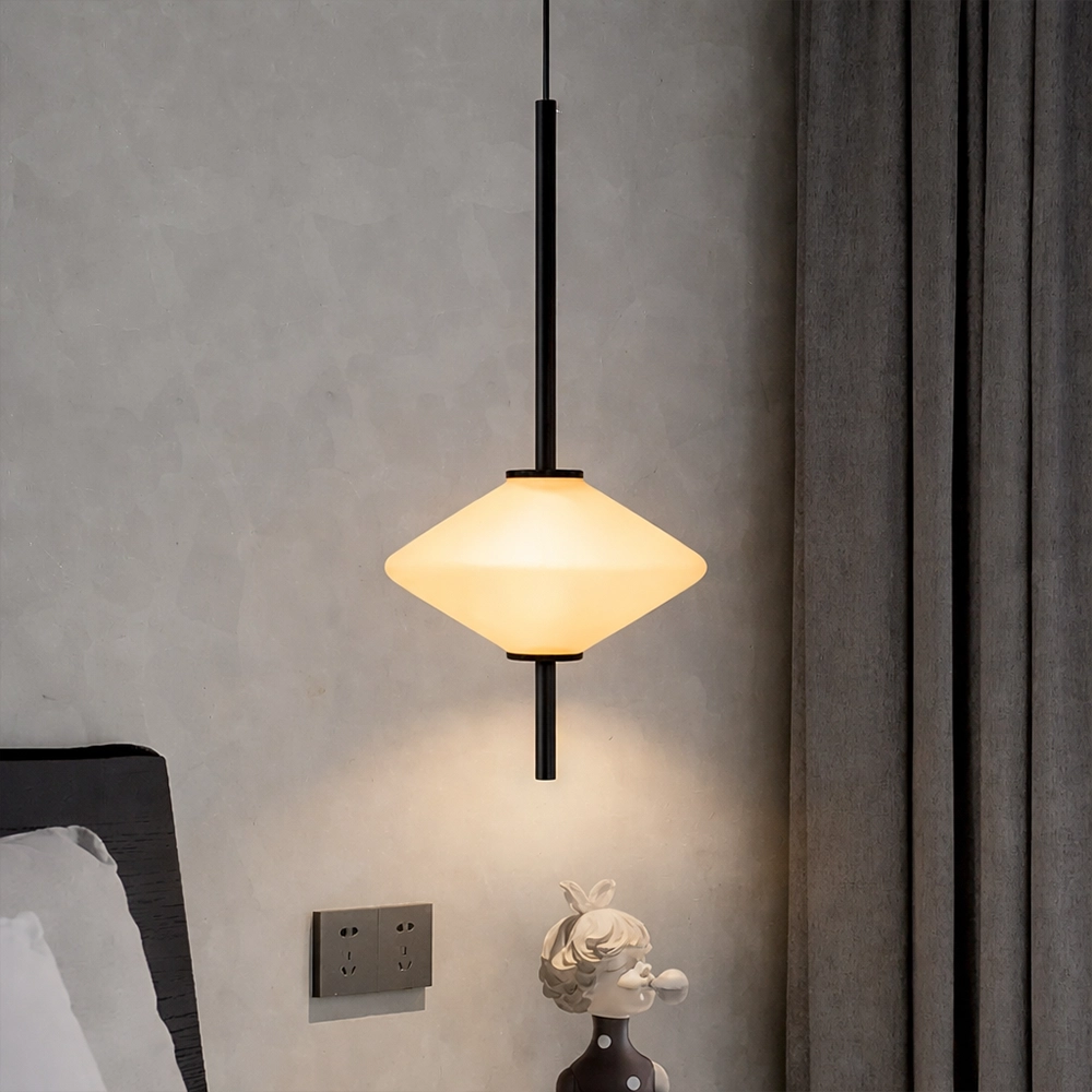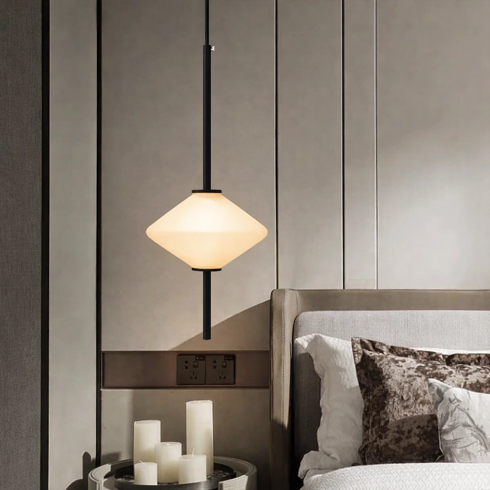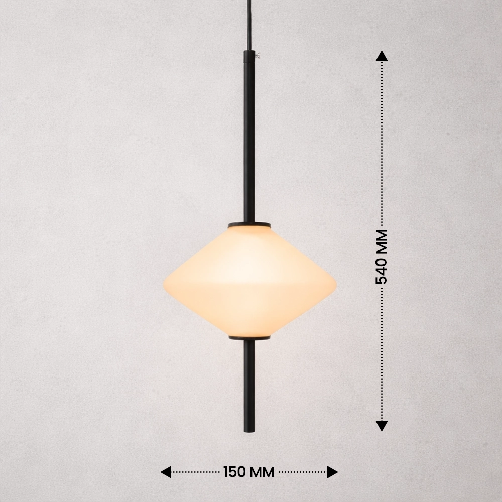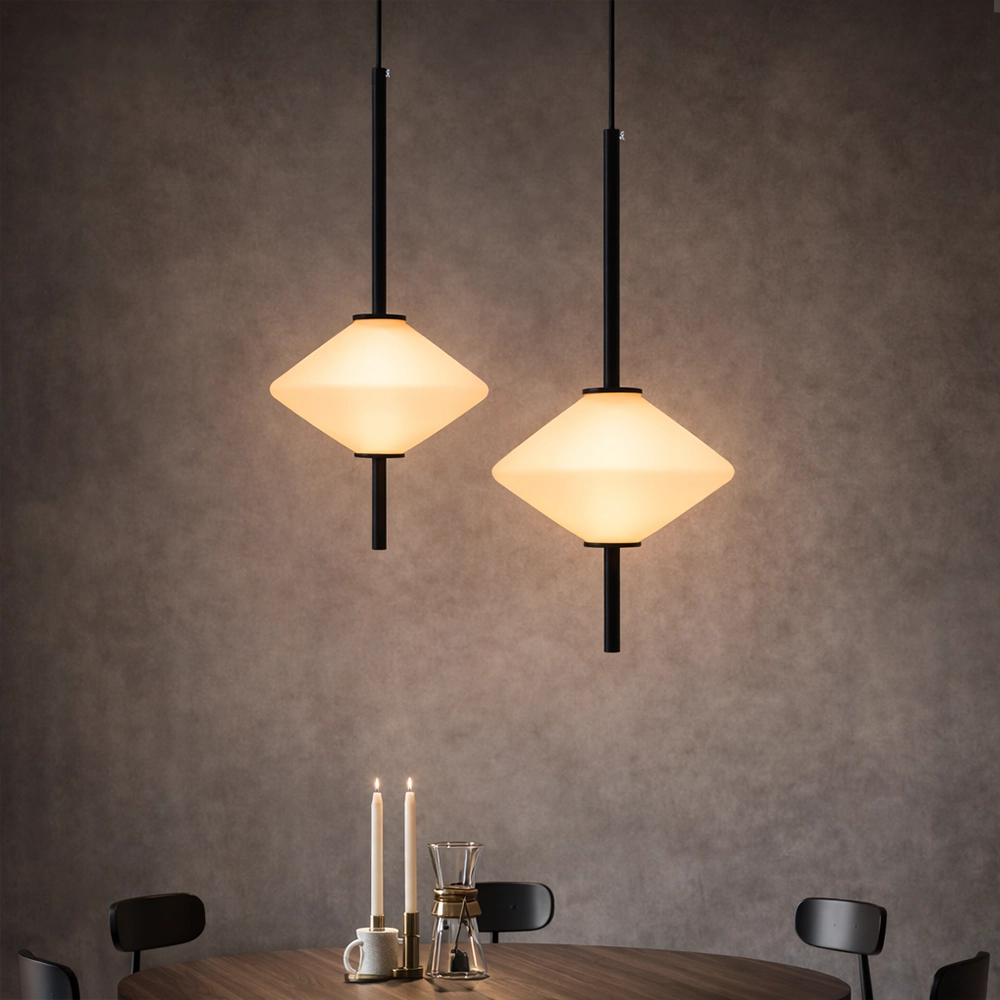 The Virello AxisLume Pendant Light is a sleek architectural lighting fixture designed for refined contemporary interiors. Featuring a slim black vertical rod and a softly illuminated diamond-shaped frosted glass diffuser, this designer pendant creates a warm, balanced glow that enhances modern living spaces.