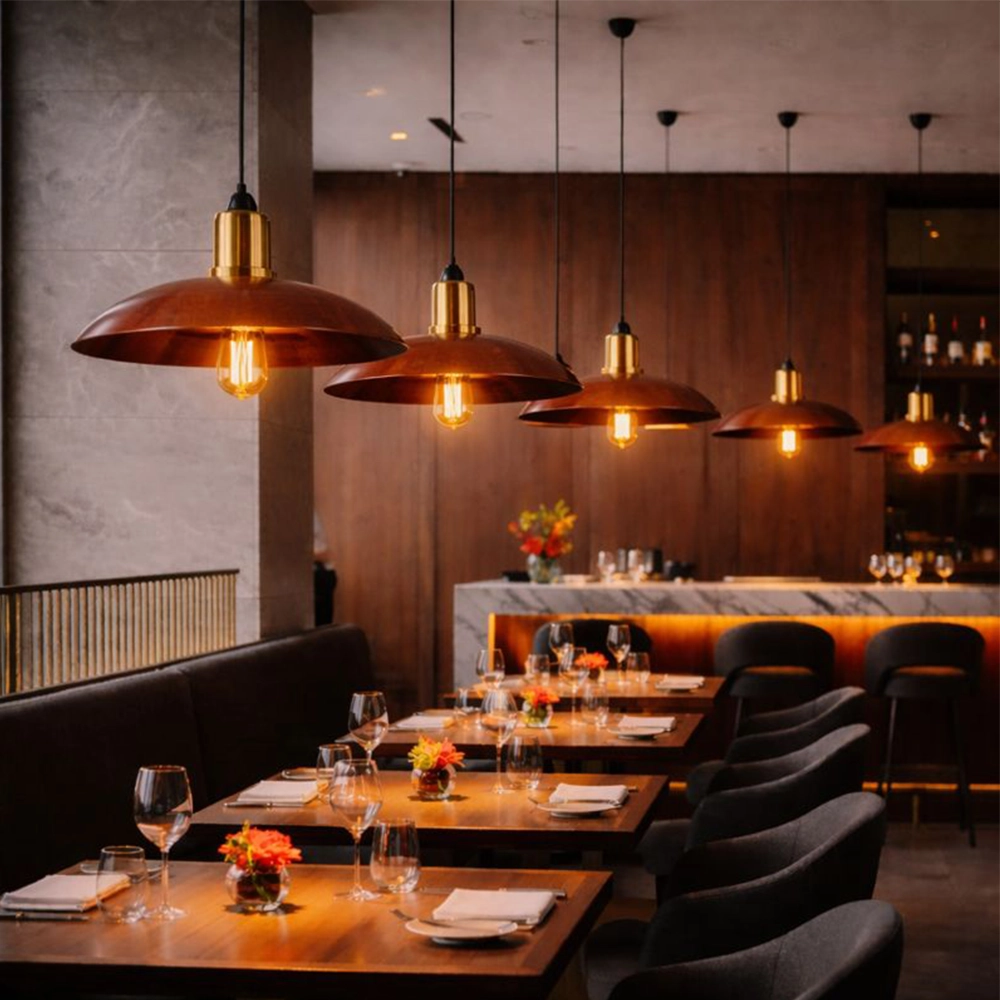 The NordicWood Dome Pendant Light combines a warm wood-finish shade with a sleek brass holder to create a cozy yet modern focal point over dining tables and kitchen islands. The wide dome throws light evenly downward, highlighting food counters, café seating, or study desks while keeping the ambience soft and inviting. Its compact size and black ceiling plate make it easy to cluster multiple pieces in bars, restaurants, or living rooms for a stylish layered lighting effect.