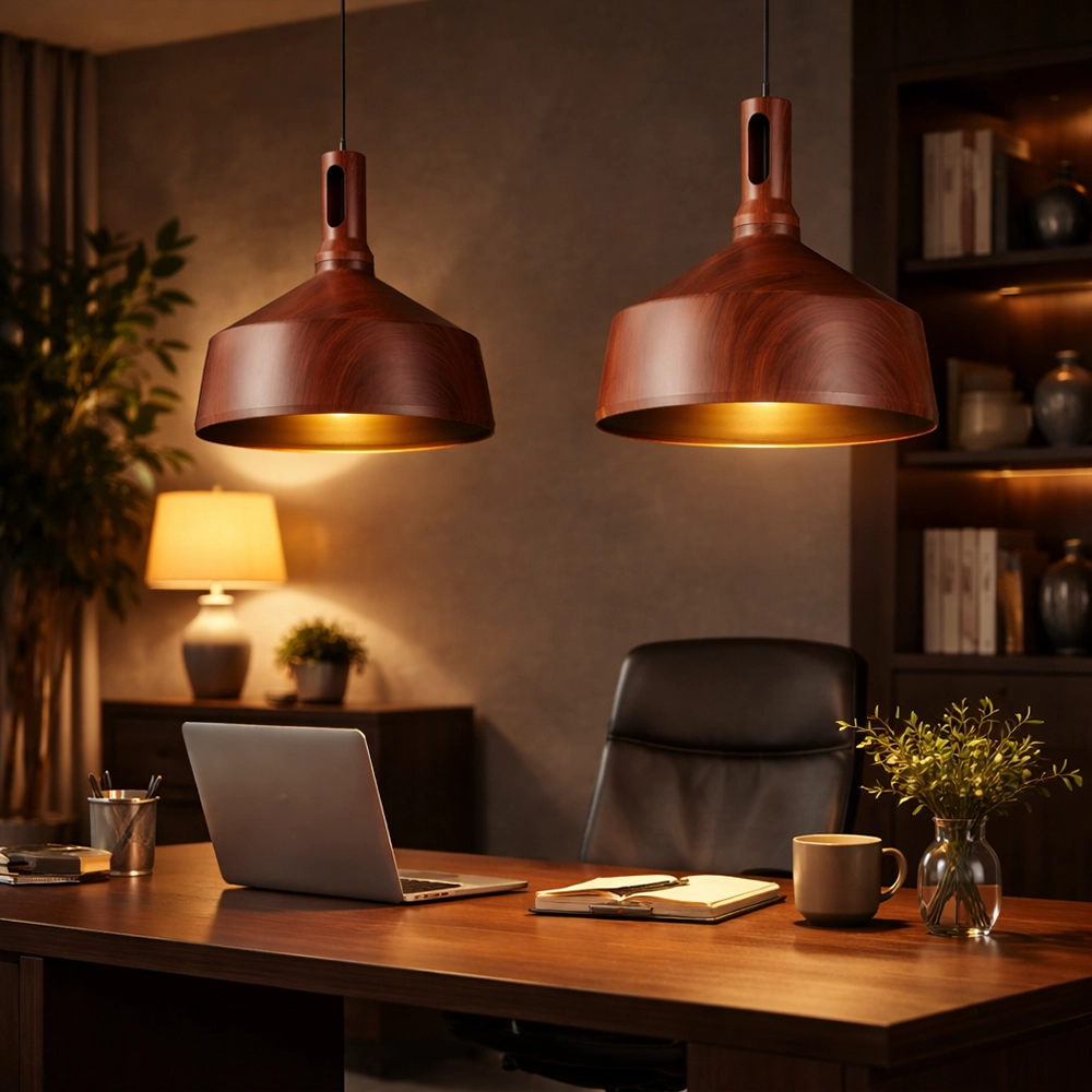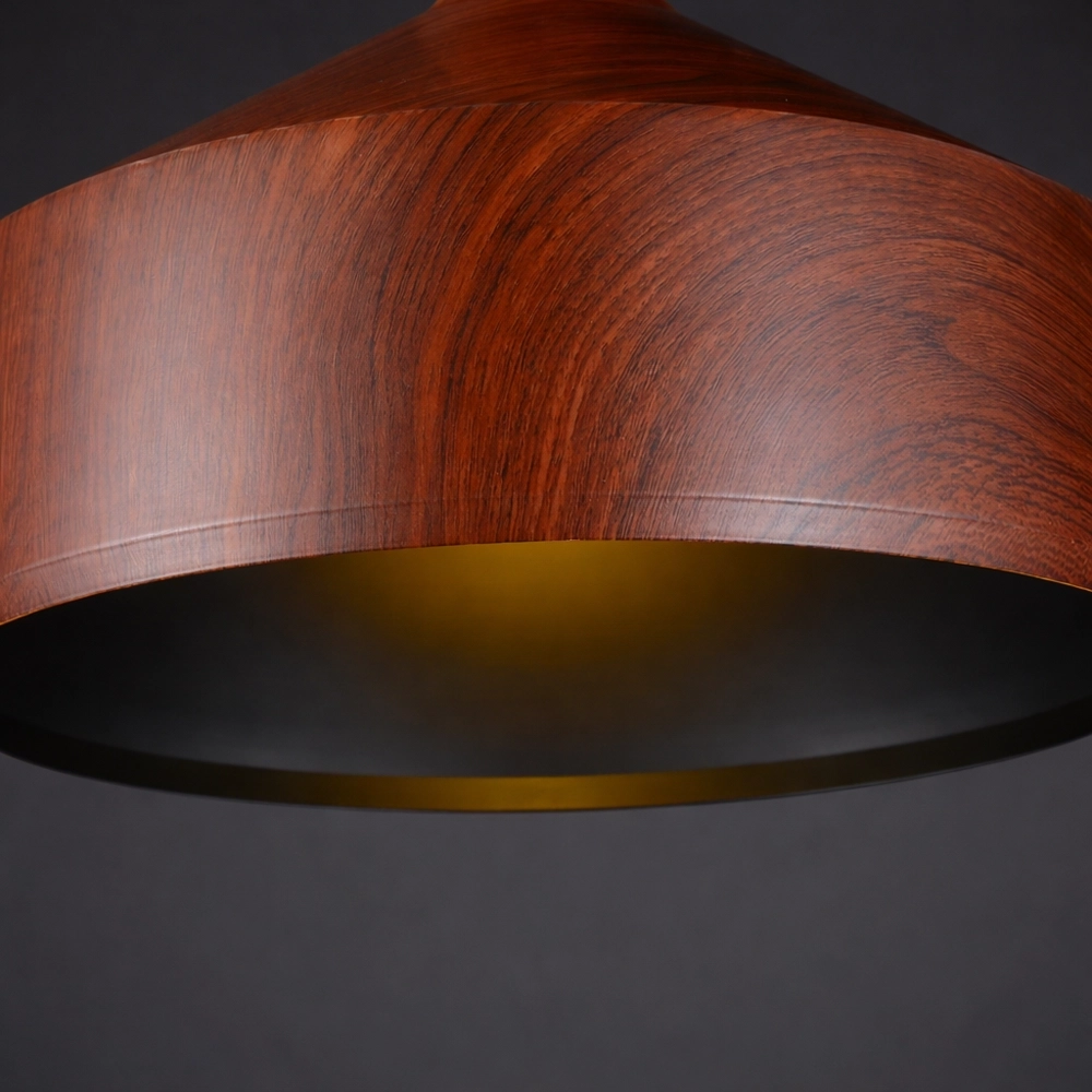 The RusticCore pendant light features a warm wood-finish metal shade with a tall neck and cut-out detail, bringing a handcrafted look to dining areas, kitchen islands, and cafés. Its deep drum profile focuses light downward to highlight tables and counters while the rich grain pattern adds cozy character to modern or industrial interiors.