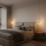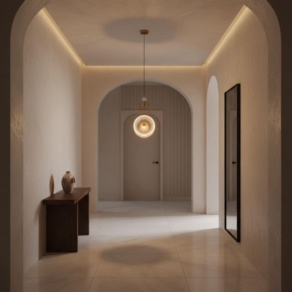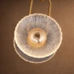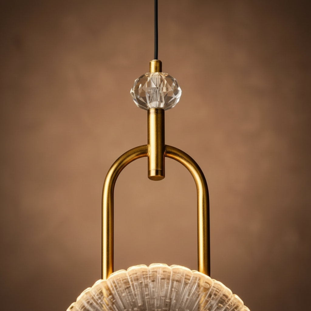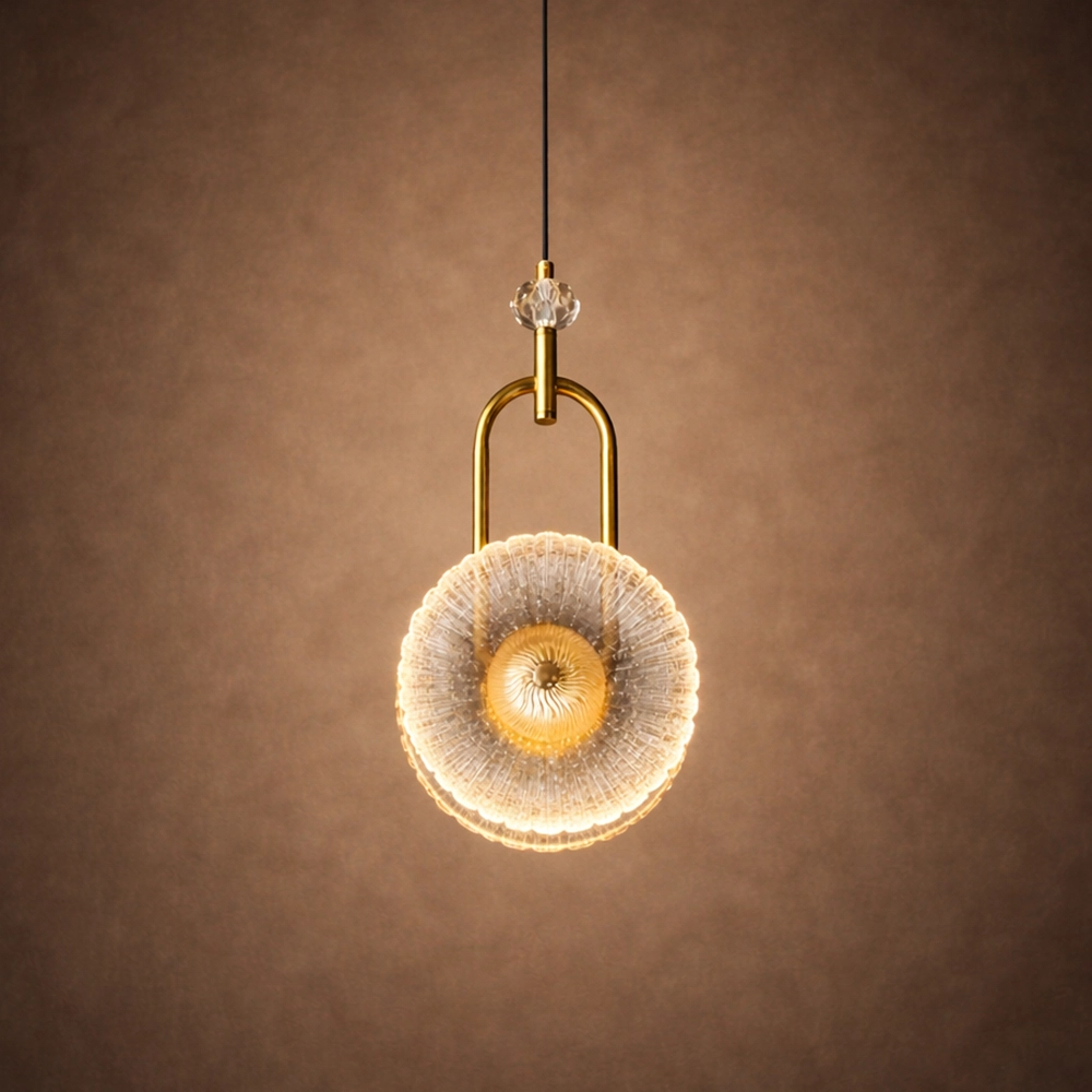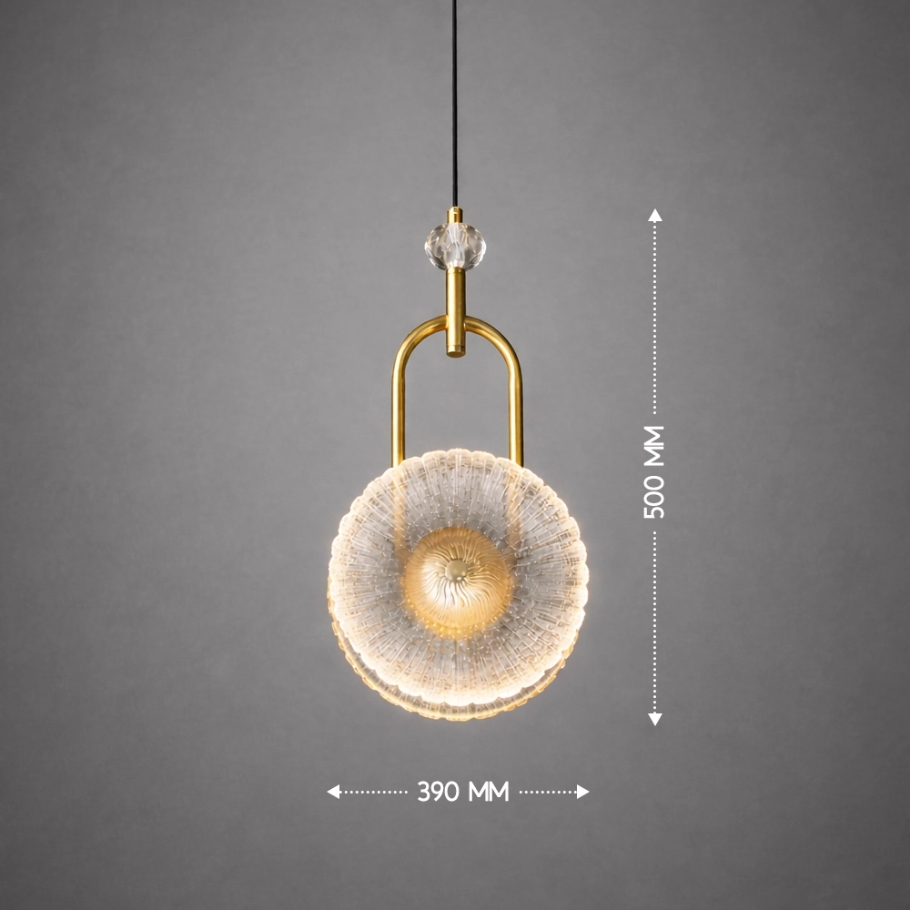 A rippled glass disc blooms around a molten gold nucleus like a magnified grain of celestial pollen, capturing sunlight in layered, glowing halos suspended from a minimalist arch. This luminous specimen hovers above cocktail bars, reading nooks, and bedside altars where botanical microscopy meets astral warmth.