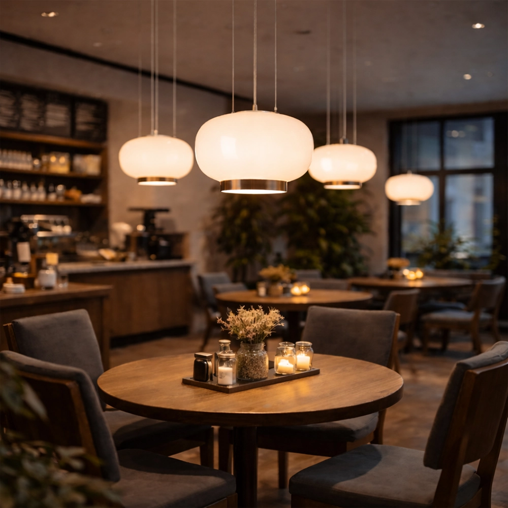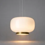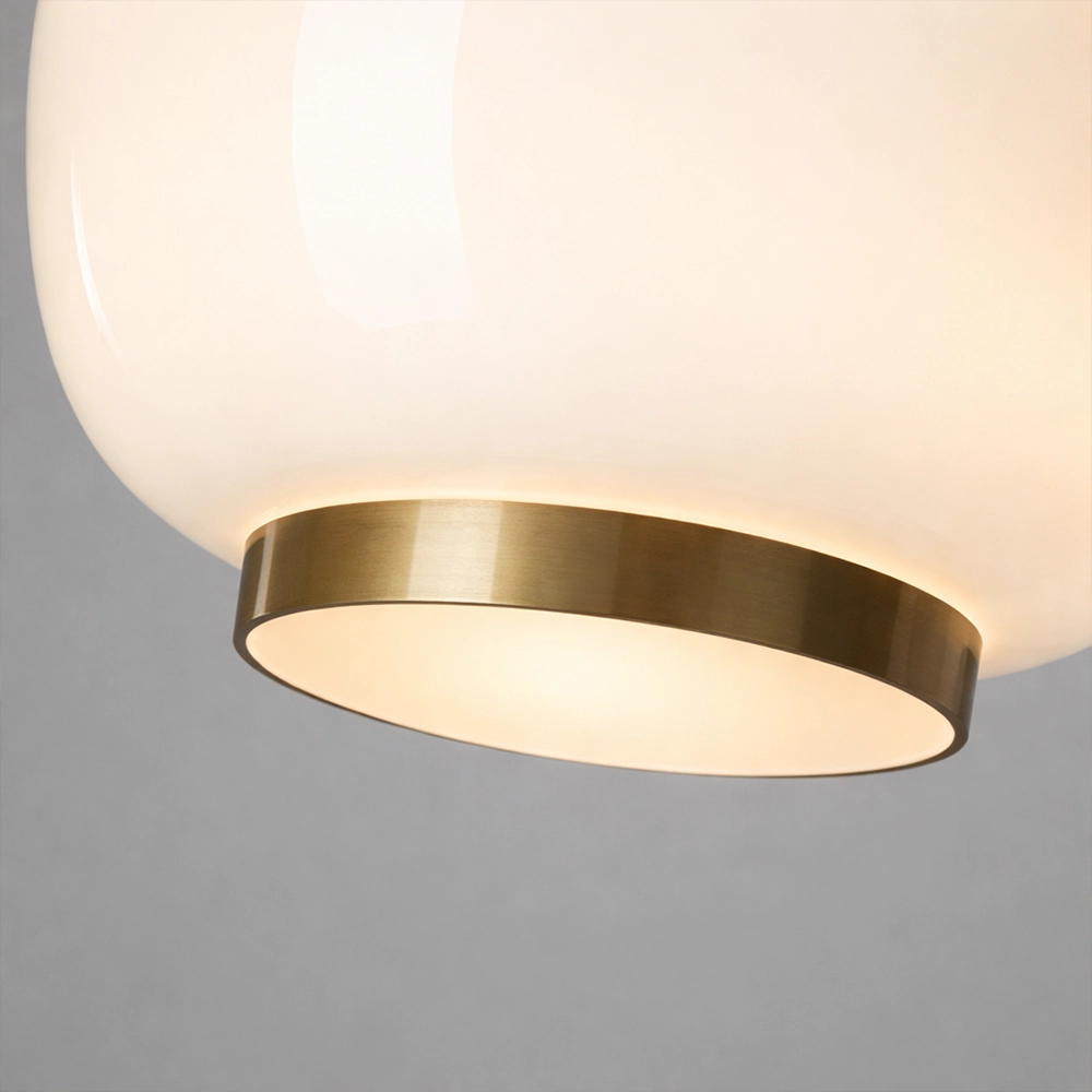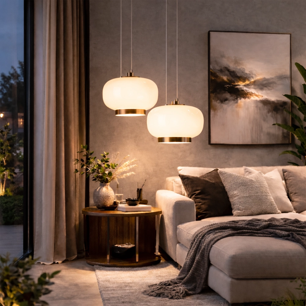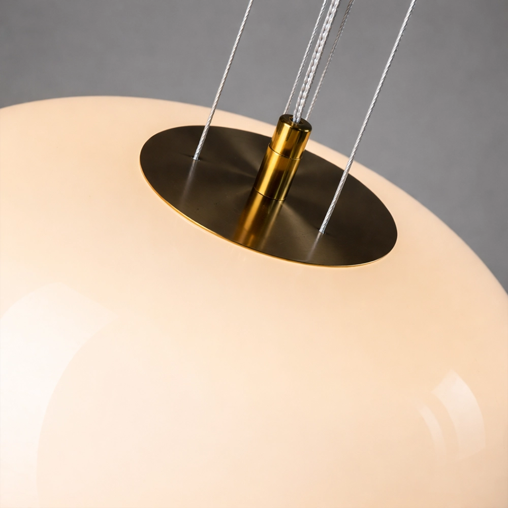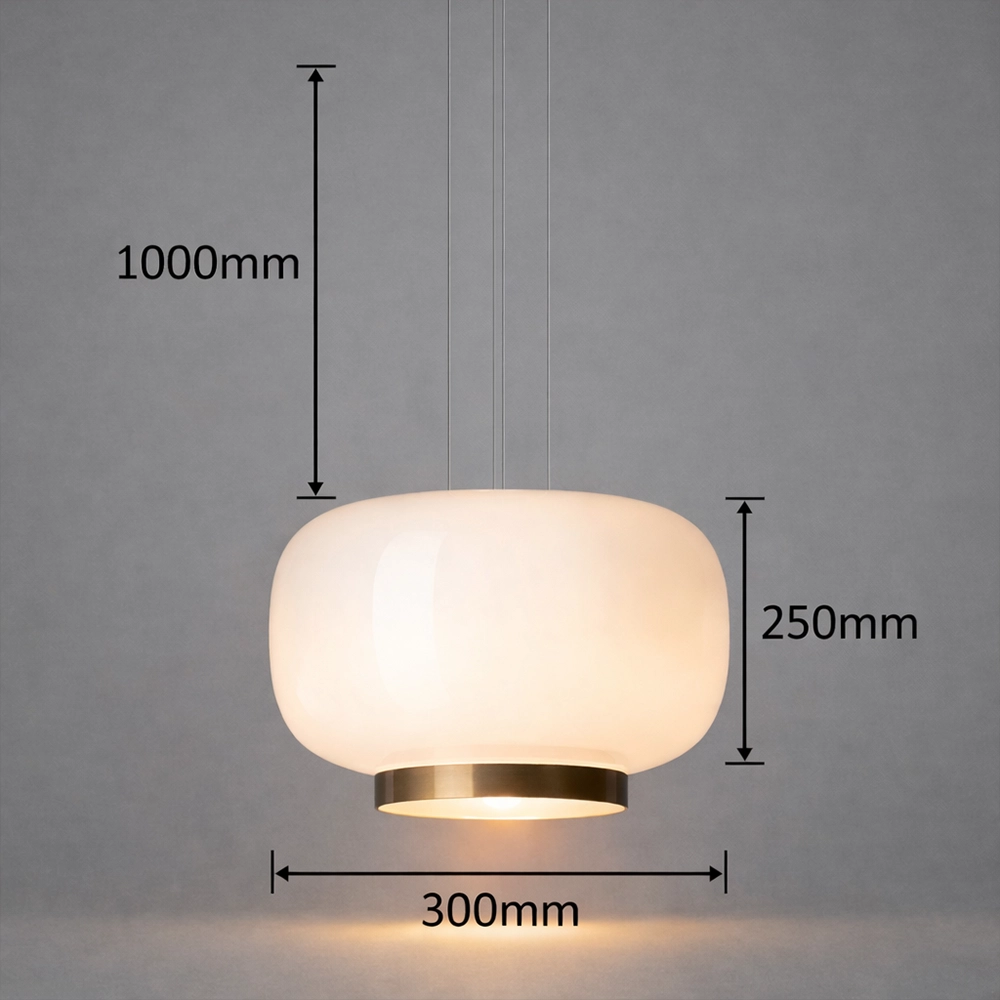 The Orvella HaloDome Pendant Light is a modern glass hanging fixture designed to deliver warm ambient illumination with refined contemporary style. Featuring a smooth rounded opal glass shade paired with a distinctive amber accent ring at the base, this designer pendant light creates a soft, welcoming glow ideal for dining rooms, kitchen islands, bedrooms, and boutique interiors.