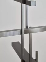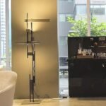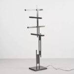 Experience cutting-edge design and precision with this modern and graphical aluminium structure floor lamp. Its sharp lasered profile adds a touch of elegance and the horizontal and vertical lines are the result of careful design analysis. The lamp features three lighting solutions that conceal an LED source, each defining its profile with a regular and insistent rhythm. Two light sources point upwards for diffused lighting, and one points downwards, making it perfect for reading.