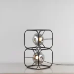 Illuminate your space with the Eternal Cascade Modern Orb Table Lamp. This unique designer desk lamp features stacked geometric frames encasing sculptural, molten glass orbs that cast an intriguing glow. Perfect as a contemporary accent light for your living room, bedroom, or office, adding an artistic and industrial touch to any decor.