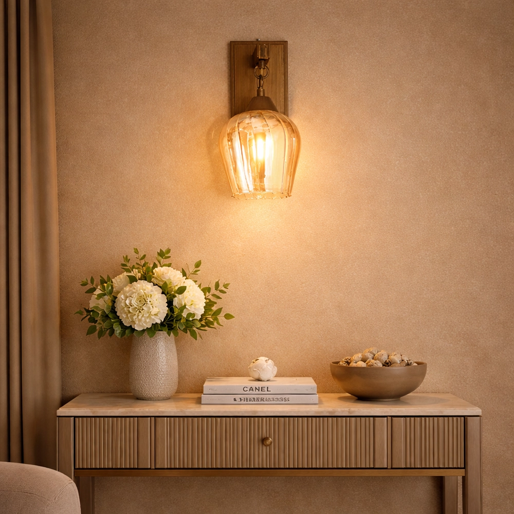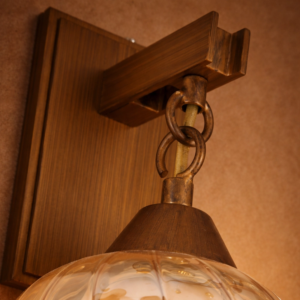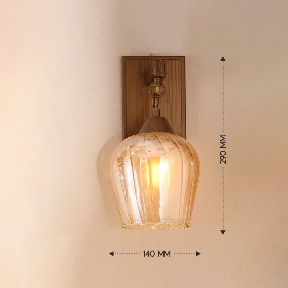 Caldera is a vintage-inspired wall lantern featuring a hand-shaped amber glass shade suspended from a solid metal backplate with chain detailing. The softly rippled glass enhances the warm glow of the light, creating a relaxed, atmospheric feel. Ideal for living spaces, reading corners, and boutique interiors that favor timeless warmth and character.