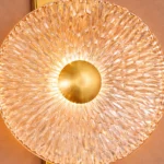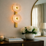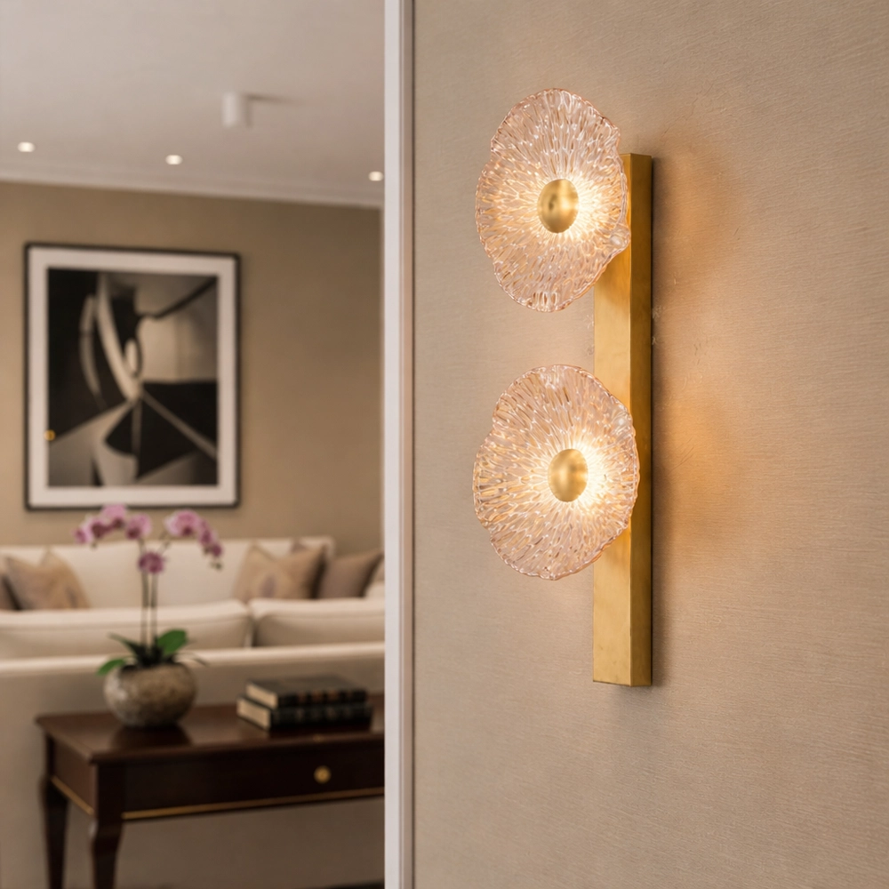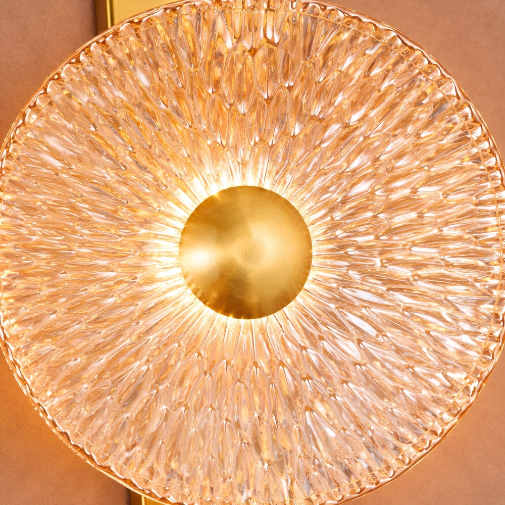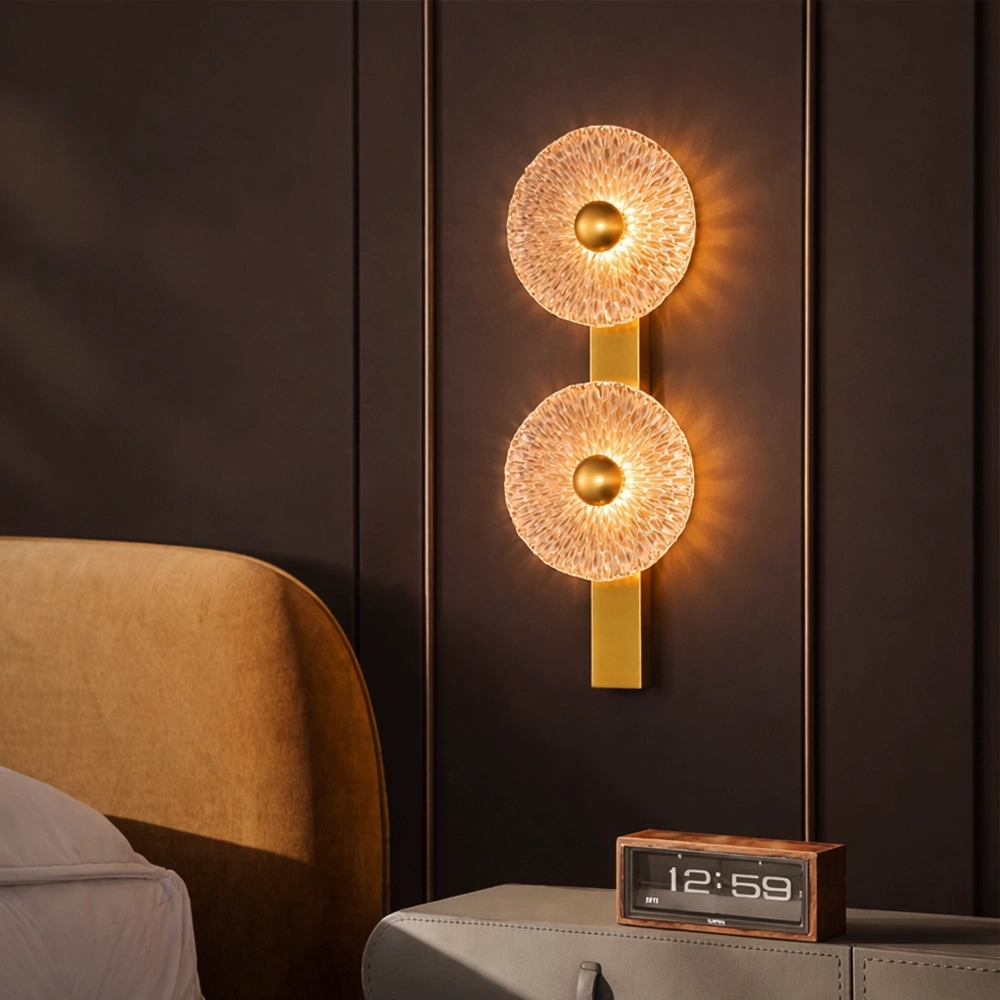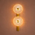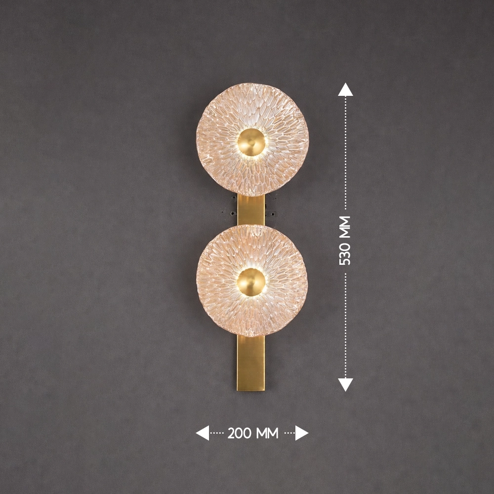 Celestia Duo is a statement wall light featuring two textured glass discs mounted on a slim brass spine. The intricate glass surface refracts light into a radiant halo, creating depth and visual rhythm on the wall. Designed for feature walls, staircases, and luxury interiors where lighting acts as both illumination and art.