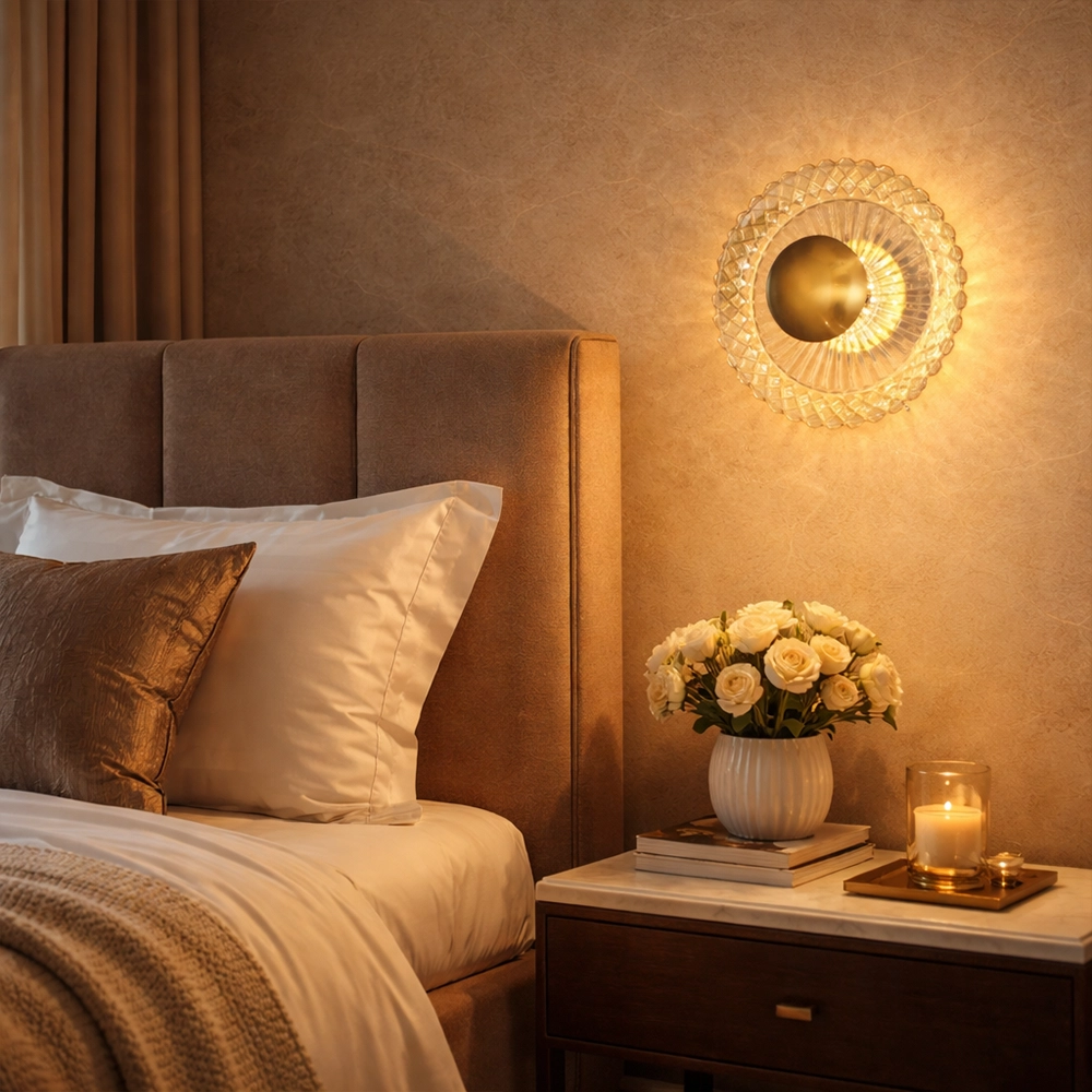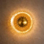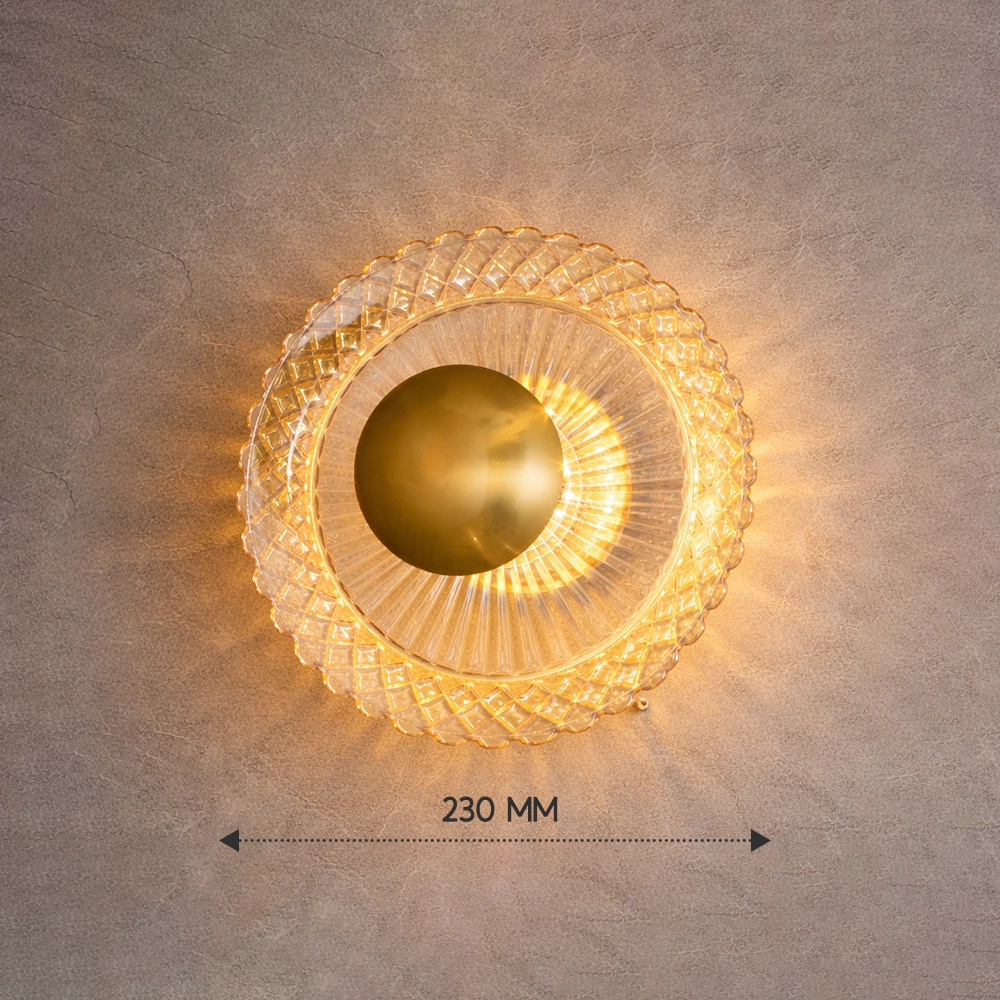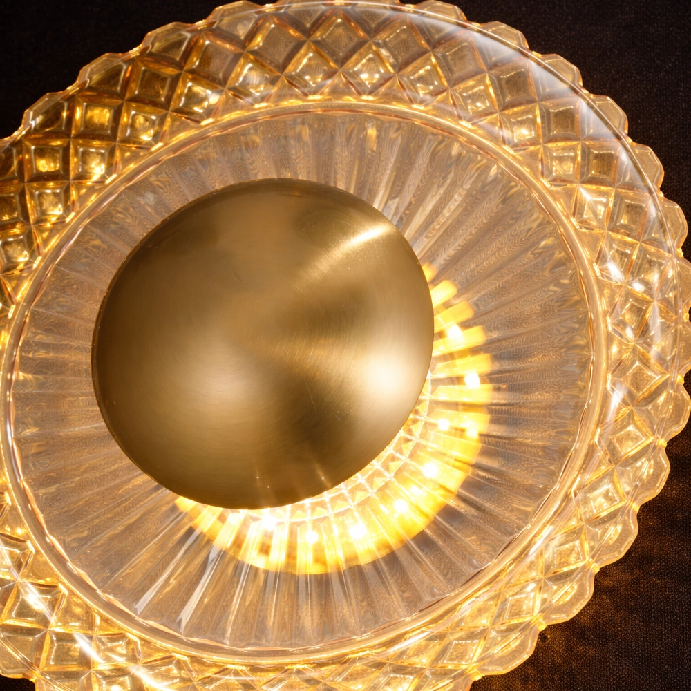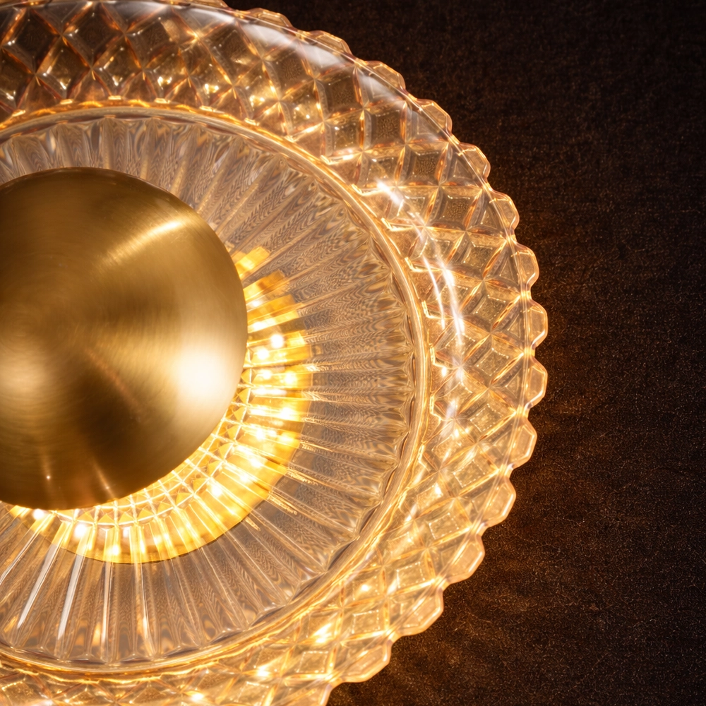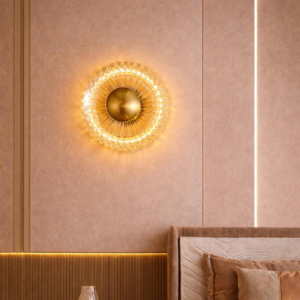 Facets of crystalline glass encircle a dominant gold orb, refracting light into a radiant corona like a diamond-crusted eclipse unveiling solar fury. This stellar beacon crowns opulent powder chambers, vaulted alcoves, and celestial observatories where prismatic rays herald cosmic rebirth.