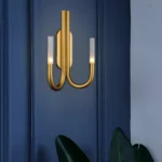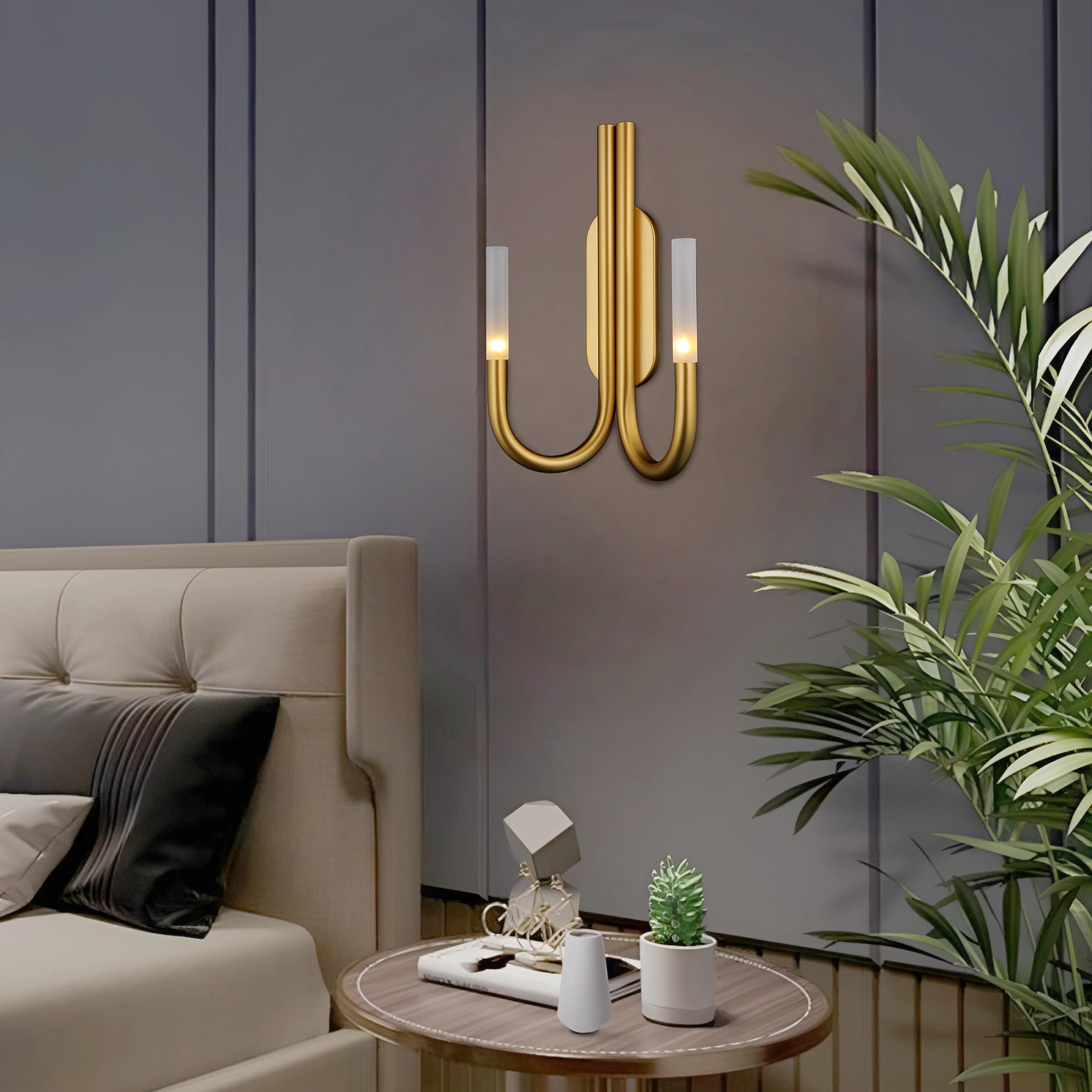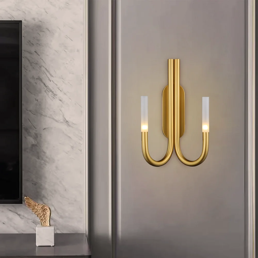 Discover the captivating appeal of the Duet Horizon Contemporary Gold Sconce, a symmetrical masterpiece designed to brighten and beautify your walls. This exquisite wall light features a radiant gold-toned finish, meticulously crafted into two perfectly mirrored U-shaped arms that extend horizontally from a central sleek backplate. Each arm supports a cylindrical frosted glass diffuser, ensuring a soft, glare-free illumination that is perfect for master bathrooms, flanking a fireplace, or creating a balanced aesthetic in a spacious dining area. The Duet Horizon seamlessly blends modern minimalism with a touch of art deco glamour, offering a refined statement piece that enhances both the visual harmony and lighting quality of your home.