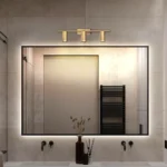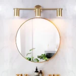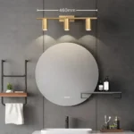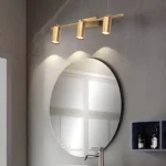 Elevate your vanity with the Golden Triad Mirror Light. This modern brass wall fixture features three adjustable cylindrical heads, casting ideal downward illumination for makeup or grooming. Perfect for bathroom decor or over-mirror accent, this contemporary vanity sconce adds a touch of luxury and functionality to any space.
