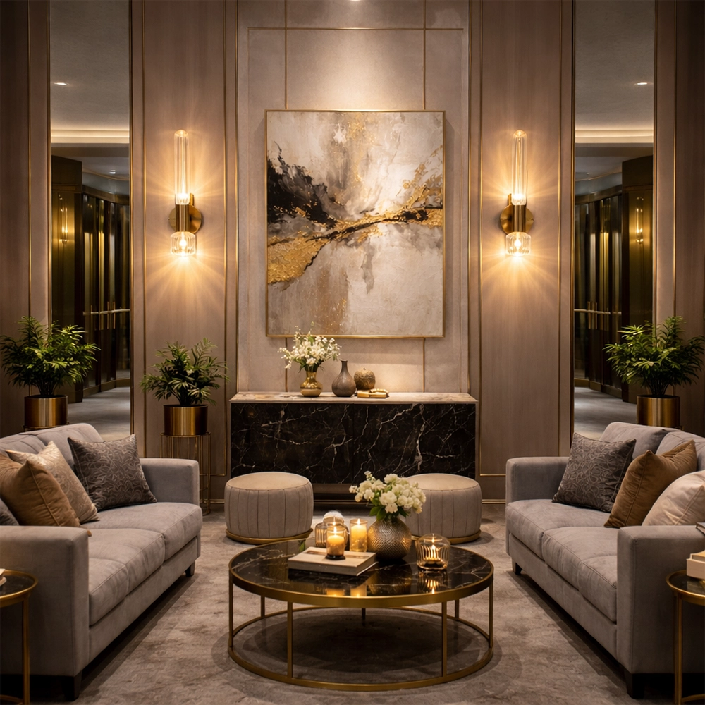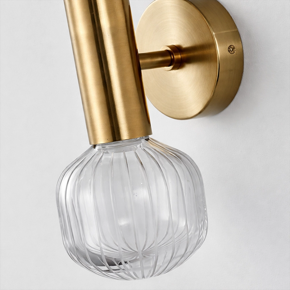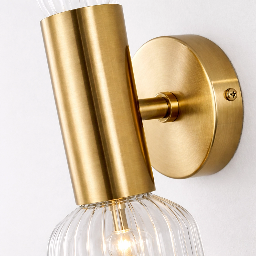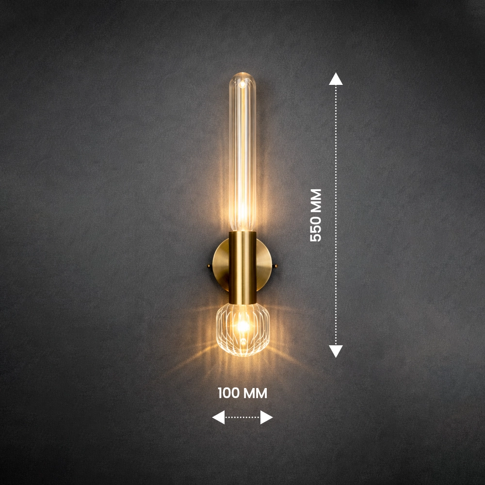The Lumivane VerticaGlow Brass Wall Sconce is a modern luxury lighting fixture crafted to bring vertical elegance and warm ambient illumination to sophisticated interiors. Featuring a tall ribbed glass tube paired with a decorative caged glass accent at the base, this designer wall light delivers layered lighting with architectural appeal.