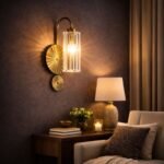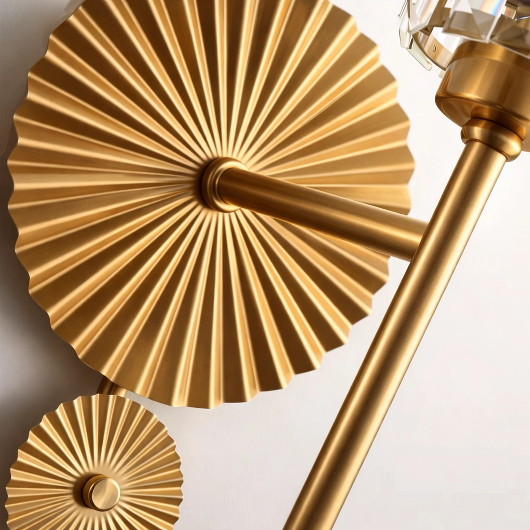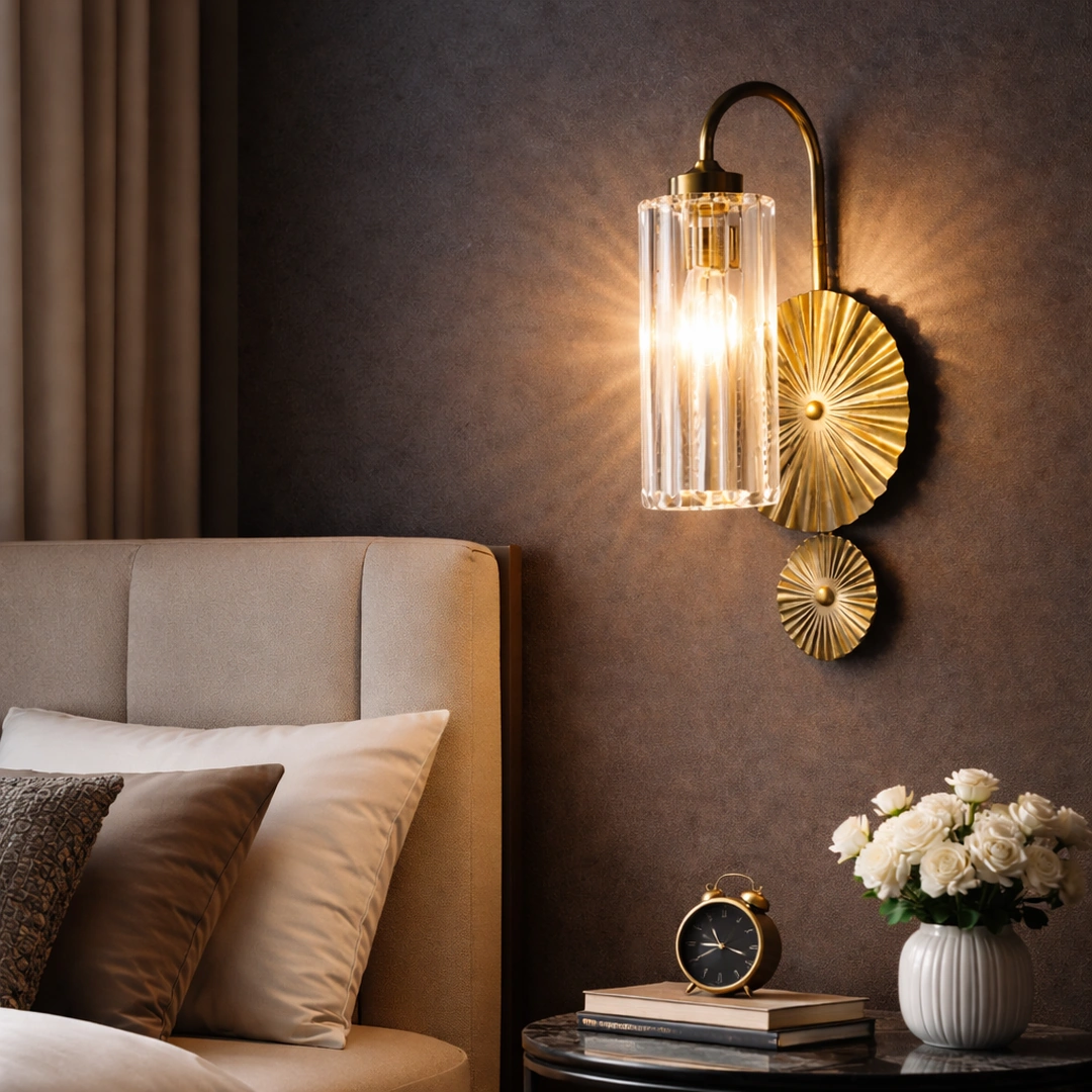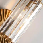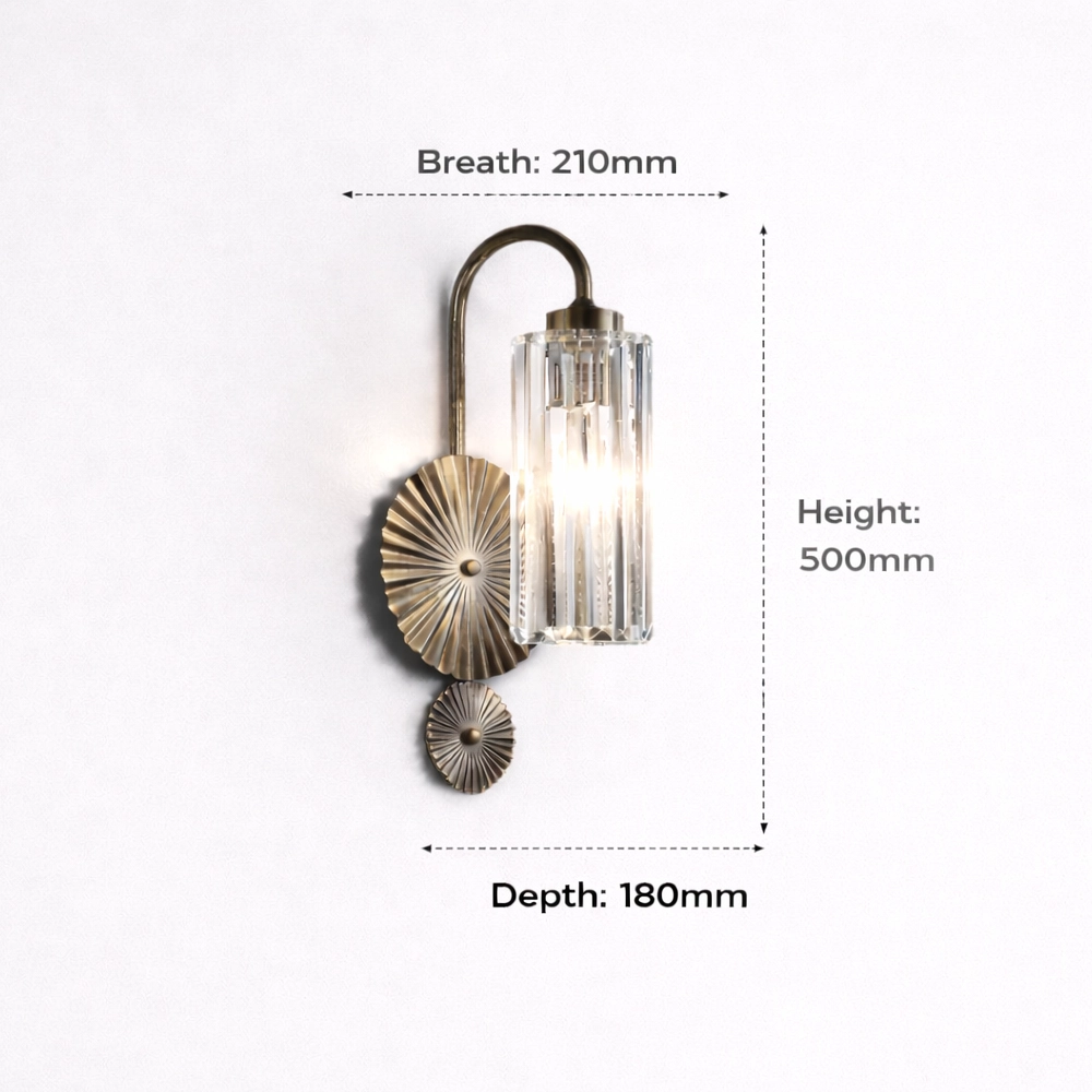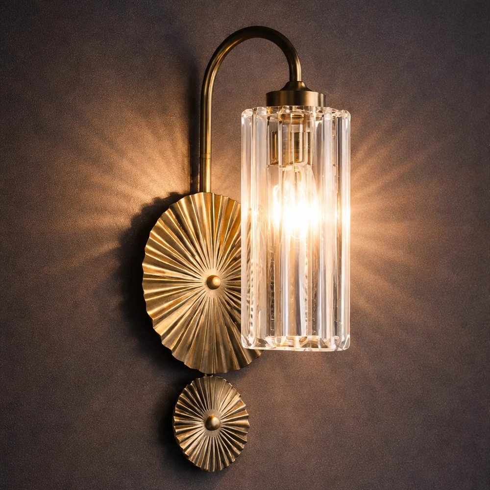 This statement wall light combines a gold fan-textured backplate with a column of clear crystal prisms, creating a sophisticated play of light and shadow on the wall. The elegant arched arm and compact design make it perfect for bedsides, hallways, living rooms, and entrances where a touch of hotel-style luxury is desired.