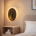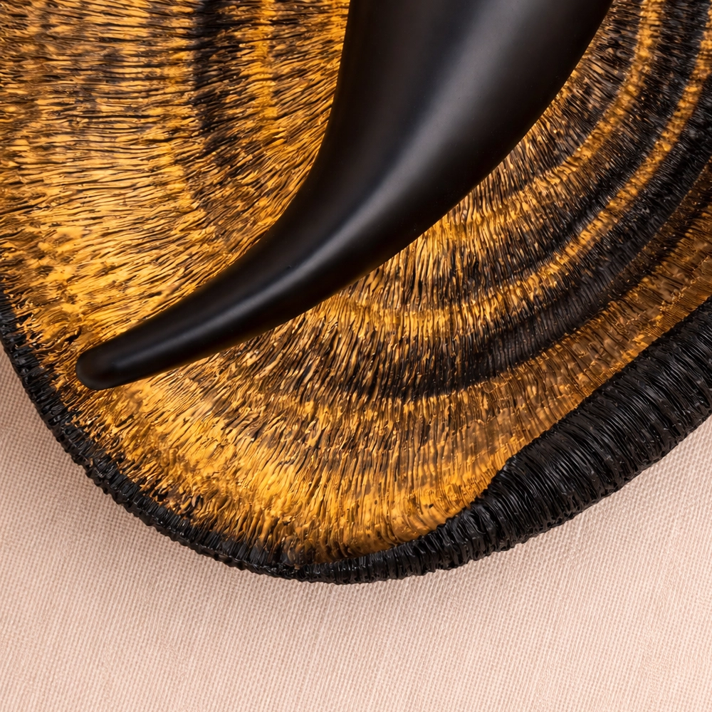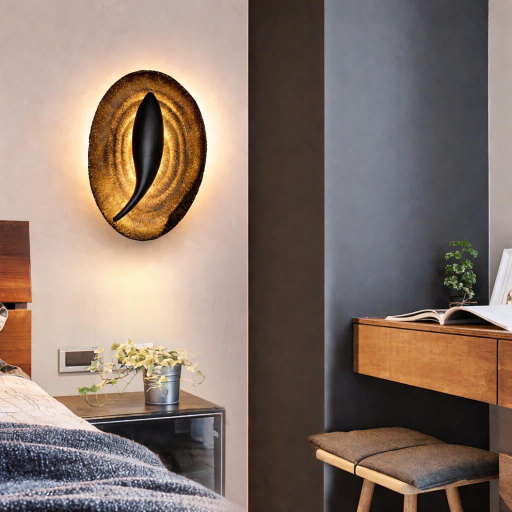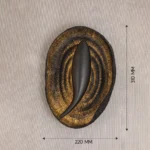 A spiraling obsidian blade pierces a rugged bronze rim, igniting radial fissures with molten veins like a cosmic black hole devouring stellar fire. This primal vortex mounts as a sentinel over forge-lit dens, subterranean vaults, and warrior sanctums where shadowed flames spiral eternal hunger.
