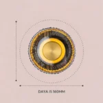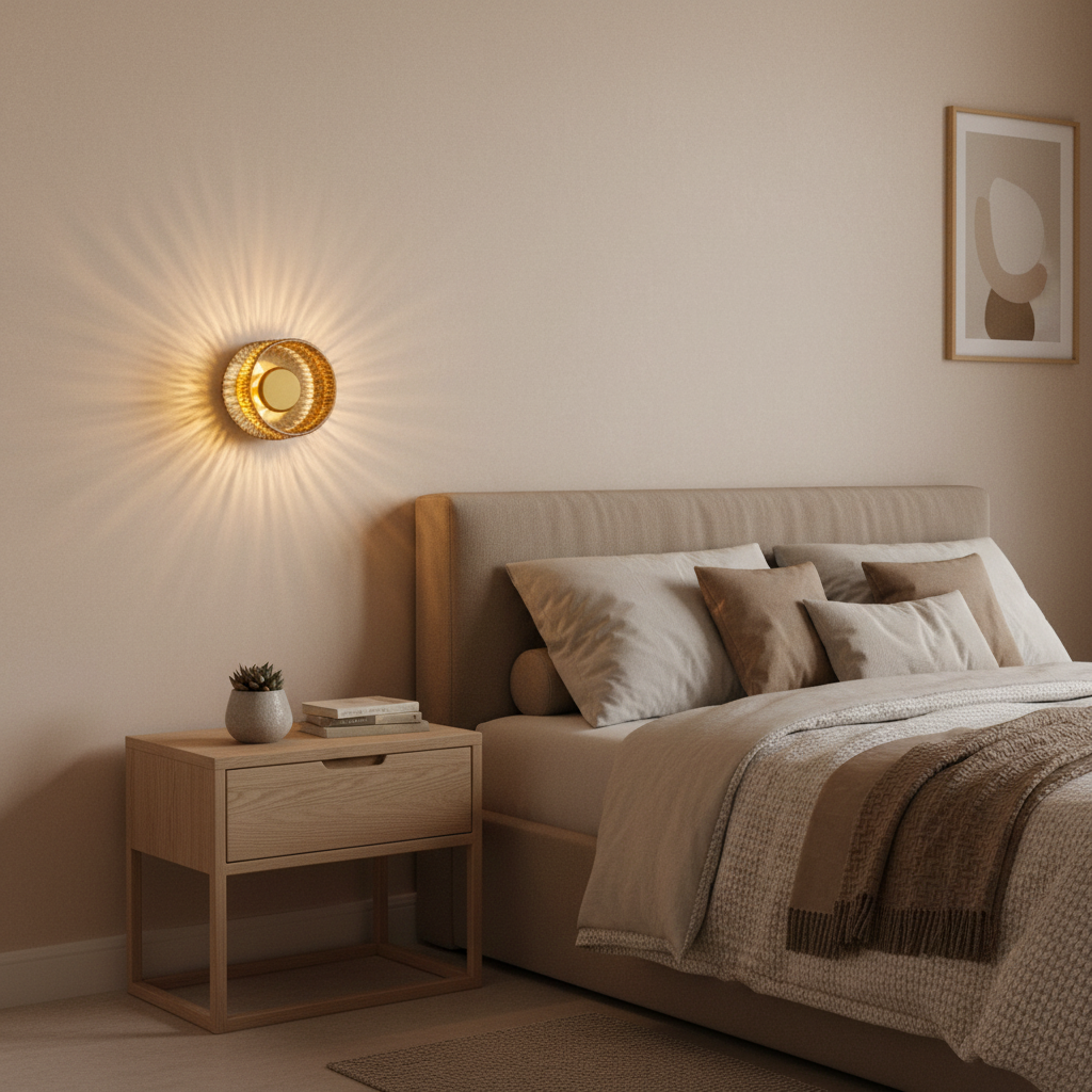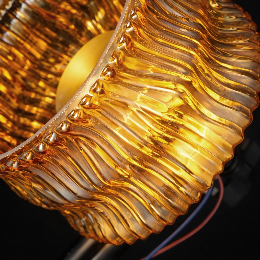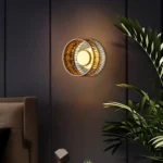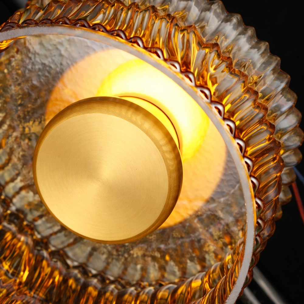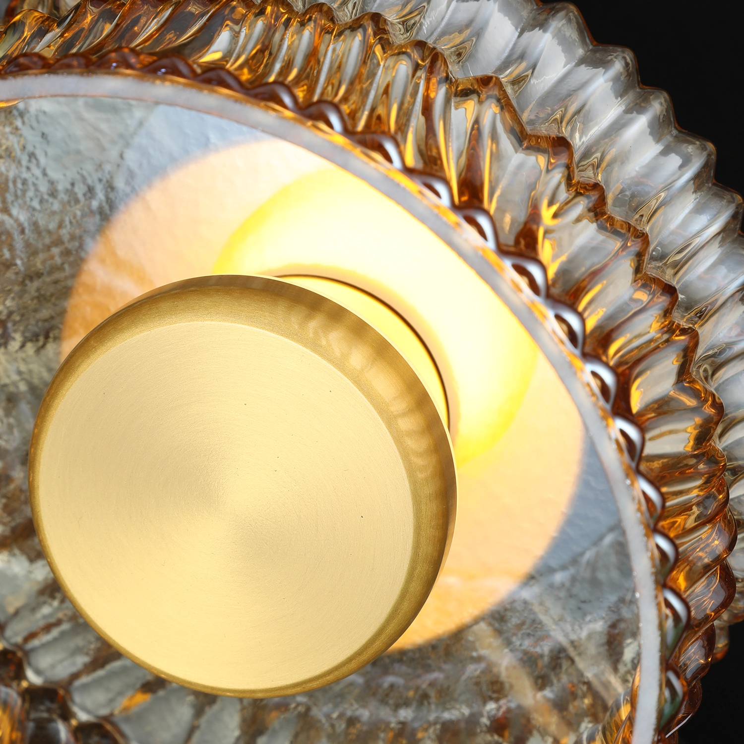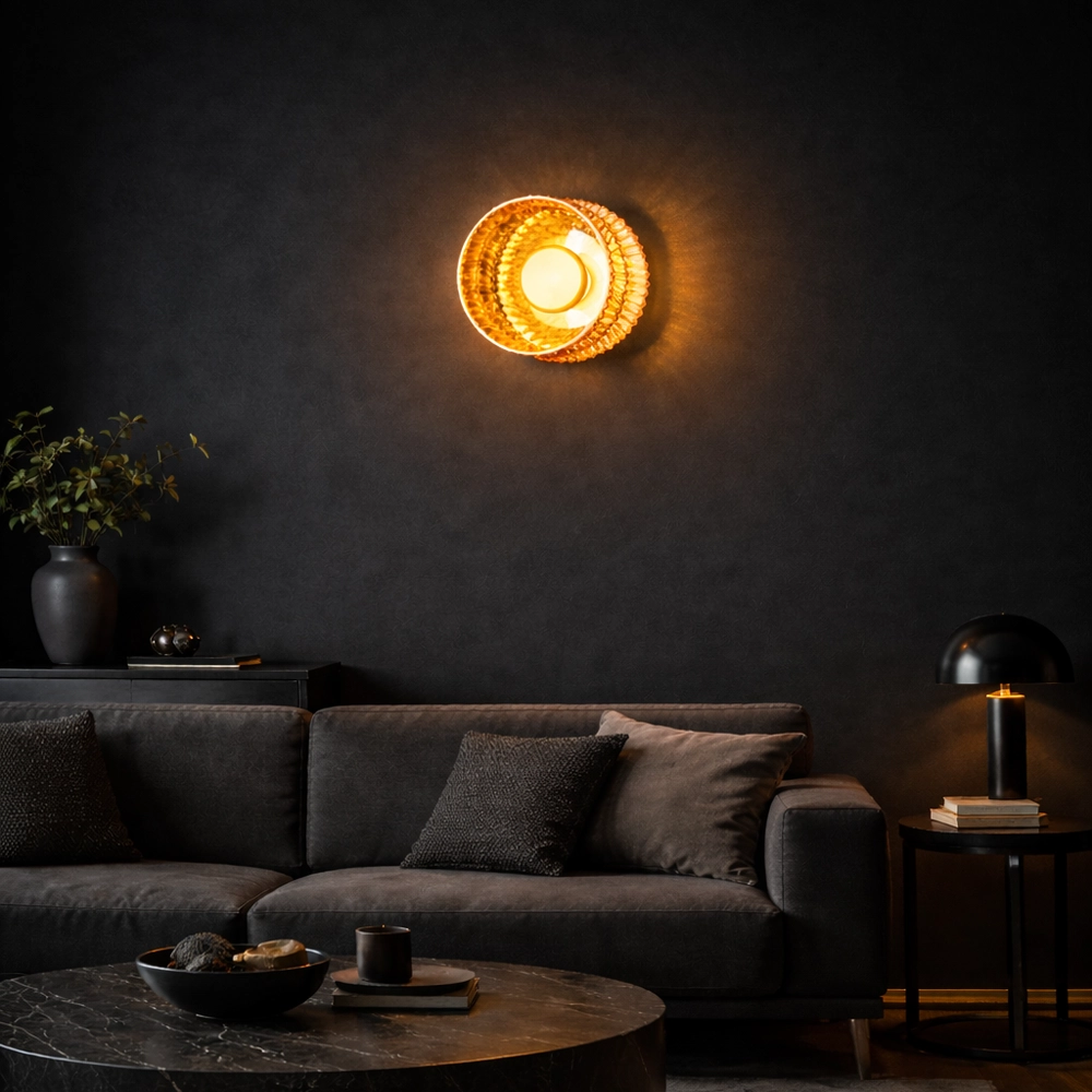 PrismAura blends a richly textured amber glass drum with a sleek brass center disc to create a luxurious modern wall light. The faceted glass ring catches and refracts the light, producing sparkling highlights and a warm golden glow against dark walls.