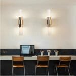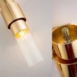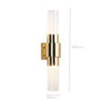 Draped in the resplendent embrace of a lustrous gold finish, the sconce transforms mere illumination into a dance of captivating brilliance. The stainless-steel frame, meticulously sculpted, serves as a testament to modern craftsmanship, exuding strength and grace in equal measure. But it’s the clear ribbed glass shades that truly steal the spotlight – their undulating texture invites light to cascade in a mesmerizing display of shadow and glow, casting an otherworldly ambiance that enchants both sight and soul.