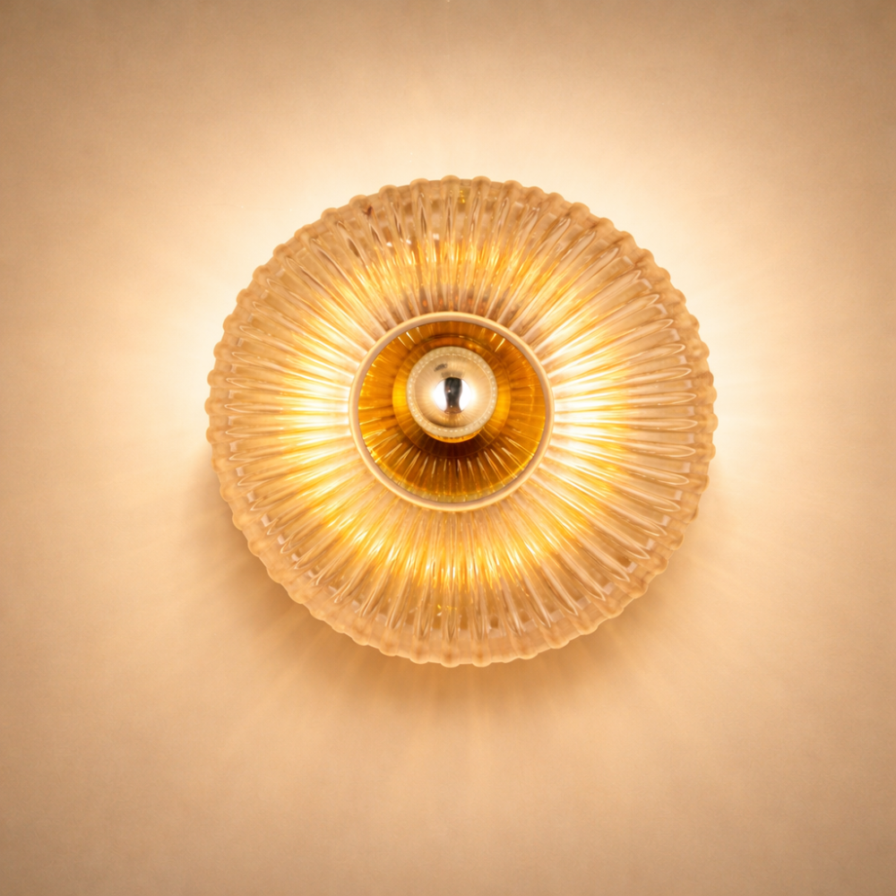 Solara Halo is a statement wall light crafted with a fluted glass disc that radiates warm, ambient light from its center. The layered glass texture creates a sunburst effect, adding depth and visual drama to walls. Ideal for feature walls, living spaces, and boutique interiors where lighting doubles as art.