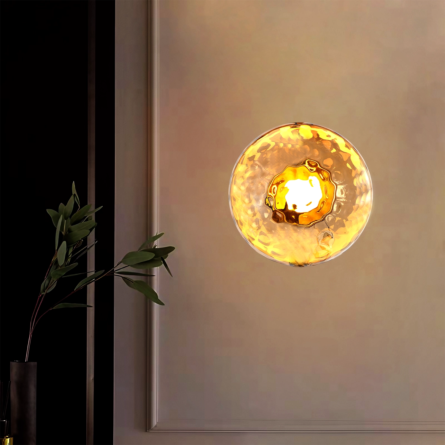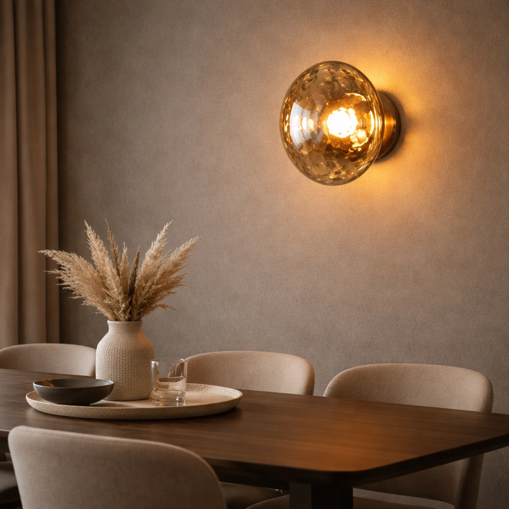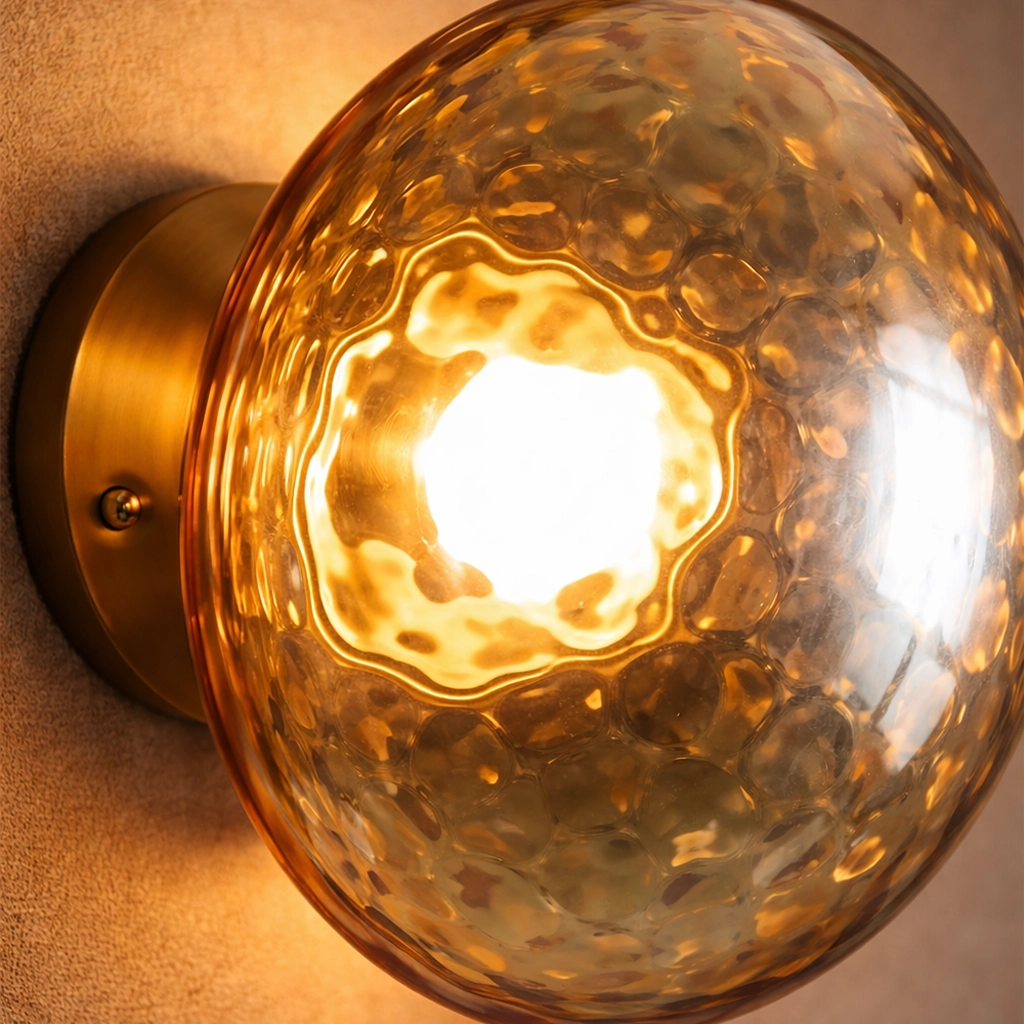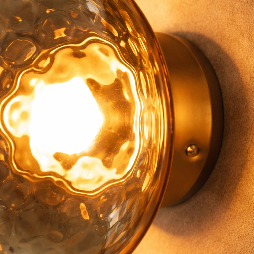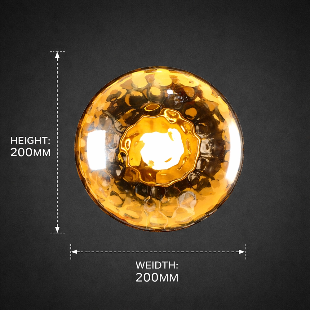 Solaris EmberSphere brings a fiery, jewel-like glow to your walls with its hammered amber glass dome and bright central core. The textured glass scatters light in warm golden tones, creating a rich, sun-like halo that instantly elevates dark walls and cozy corners.