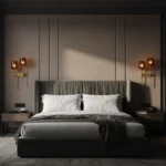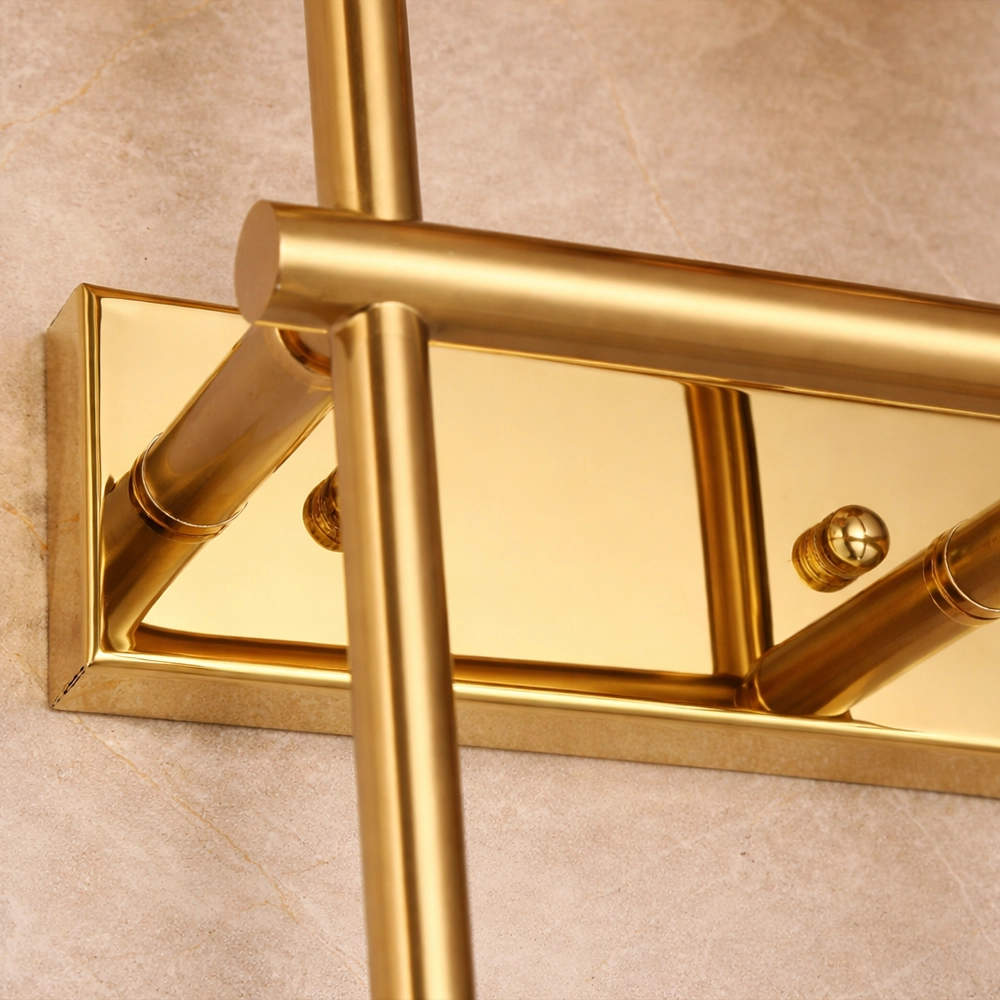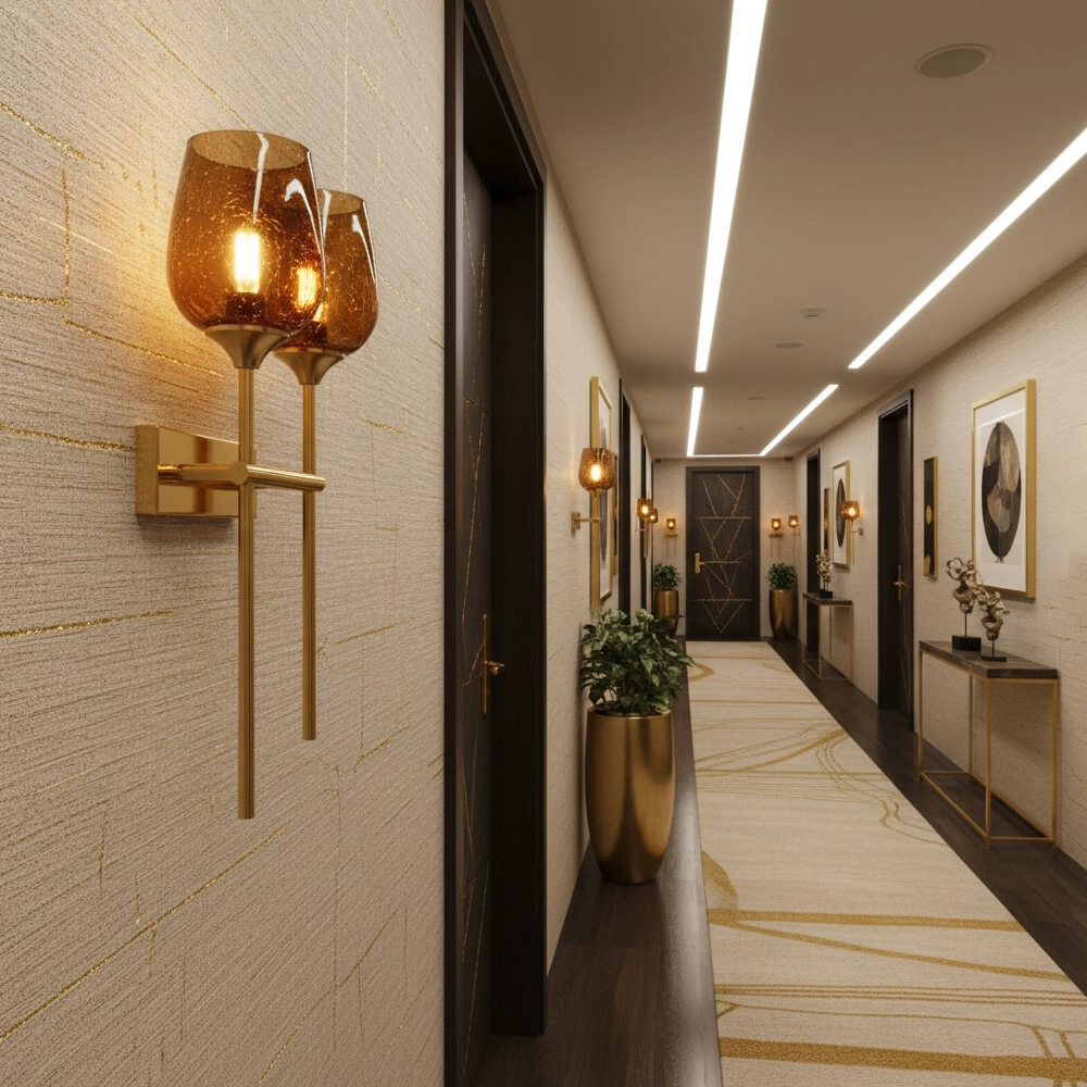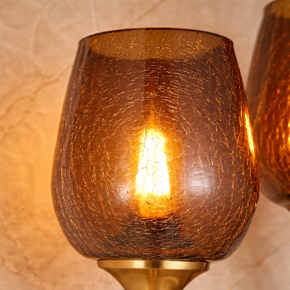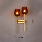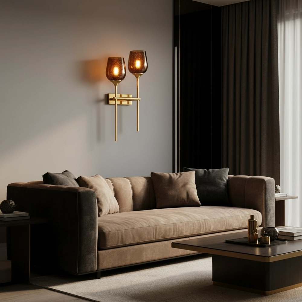 Paired textured glass goblets brim with smoldering bronze glow on tall brass stems, like twin chalices toasting eternal dusk in mirrored elixir dance. Mounted on a shared gilded throne, these luminous twins flank vanity realms, tavern hearths, and opulent powder passages where fire-kissed vintages seduce the senses.