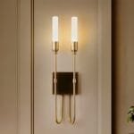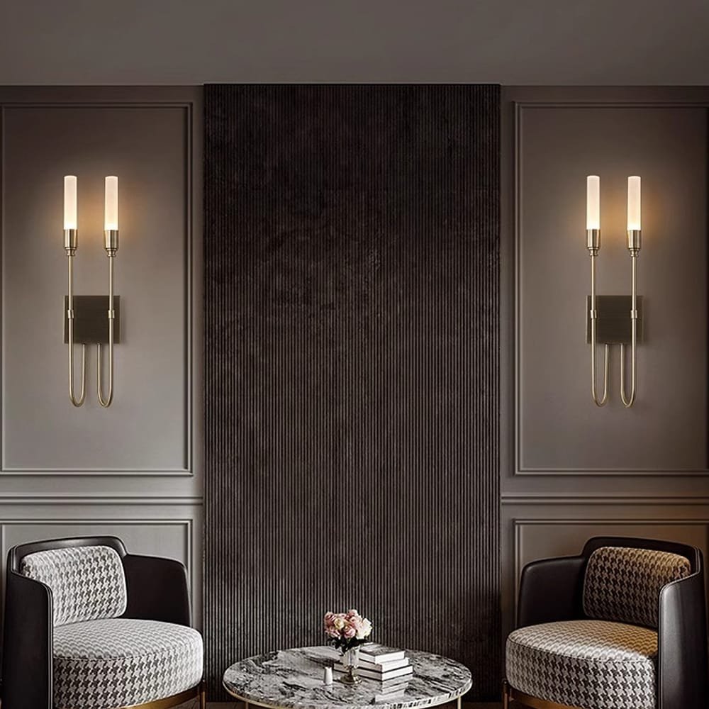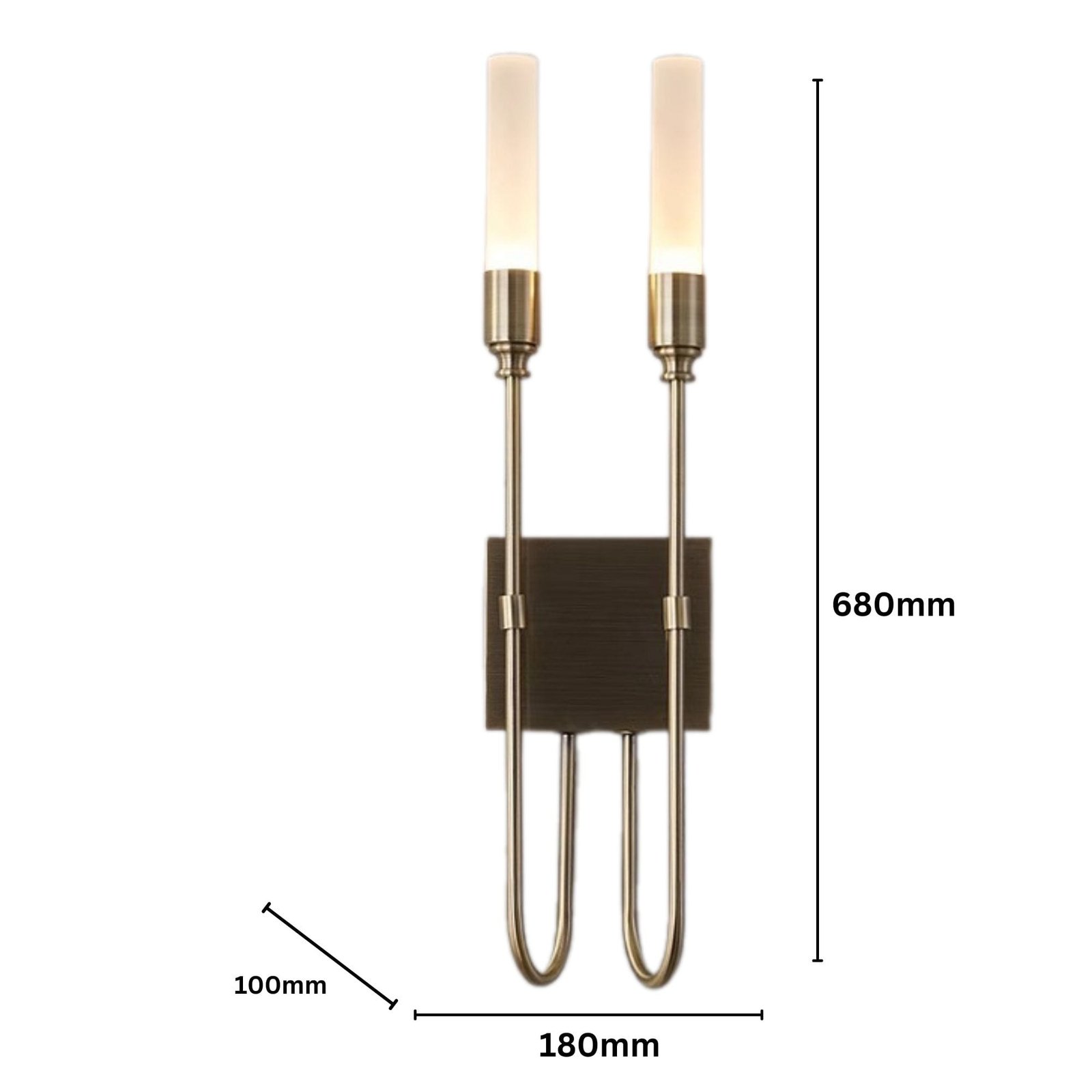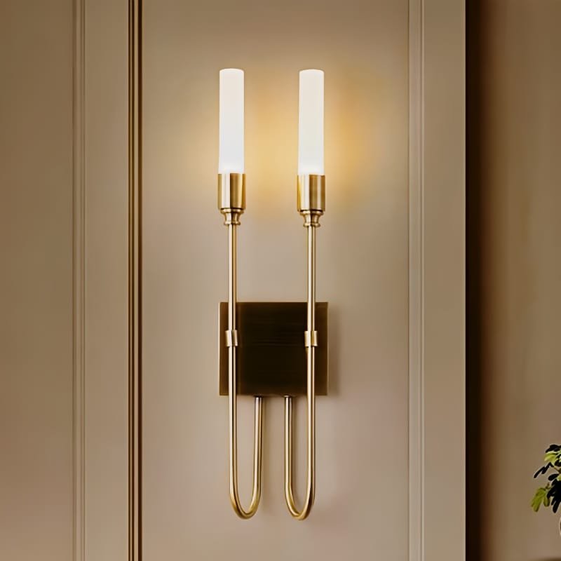 The Twin Rays of Illumination wall light features a sleek, modern design with dual elongated frosted glass lamps that cast a soft, ambient glow. Perfect for adding elegance to hallways, living rooms, or bedrooms, this wall fixture combines style and functionality. Its polished brass finish and minimalist structure offer a touch of luxury while providing balanced, soothing light. Ideal for both contemporary and classic interiors, Twin Rays of Illumination enhances your space with sophisticated lighting and a warm, welcoming atmosphere.