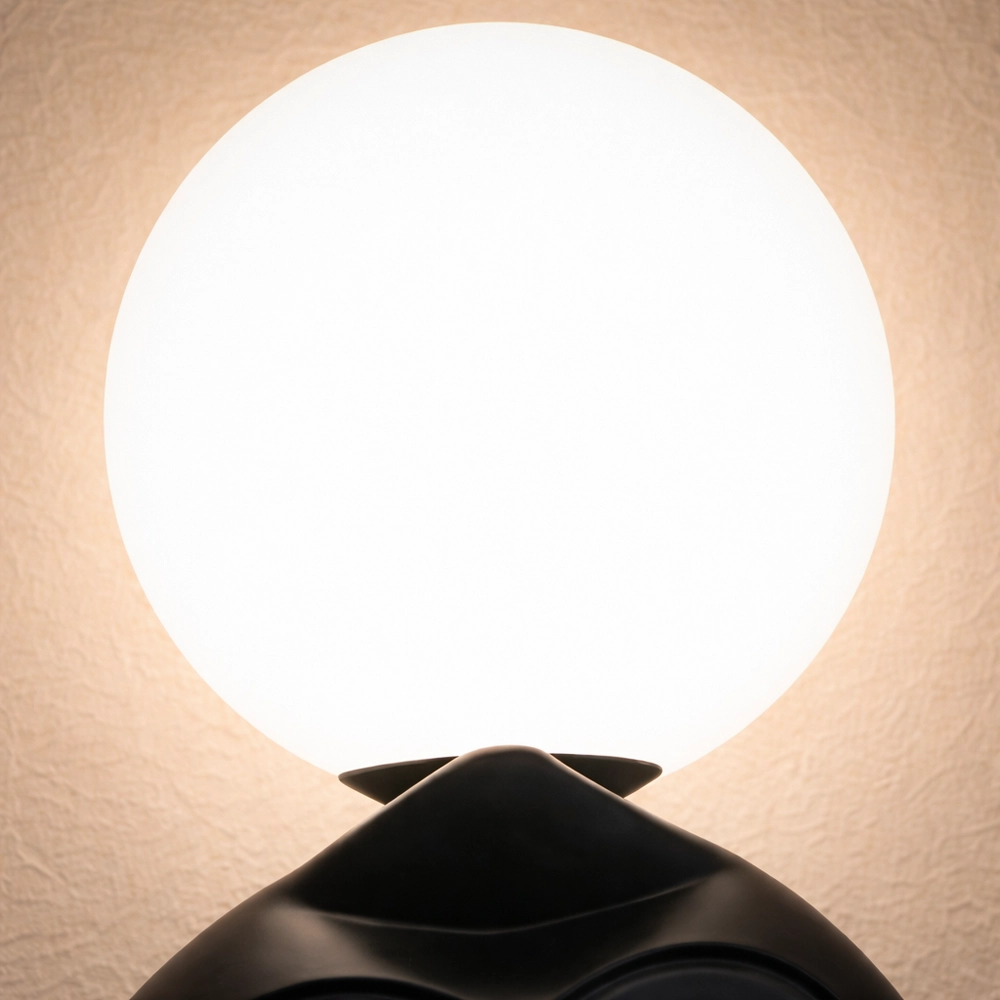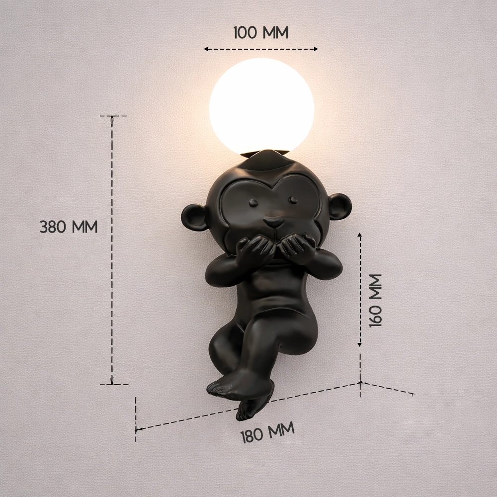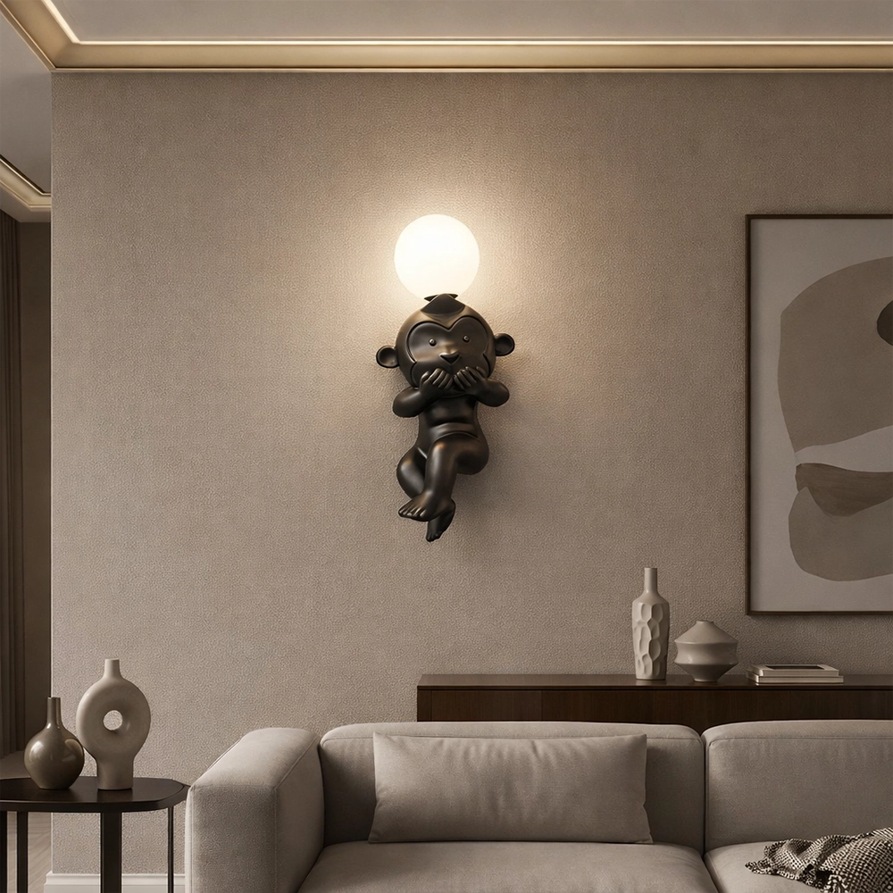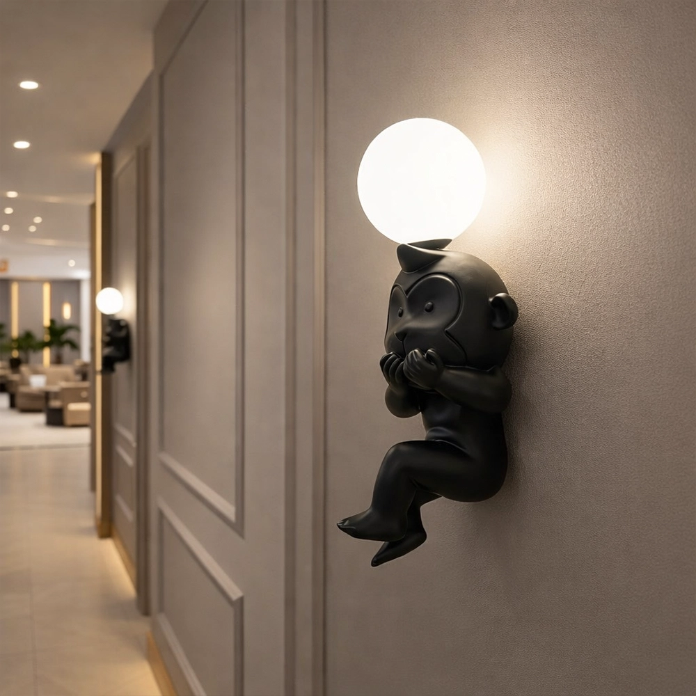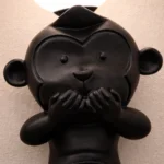 A mischievous matte black monkey clasps its paws over a luminous orb like it’s guarding a forbidden moon, its sly gaze casting secretive shadows across gallery walls and moody bars. This enigmatic trickster haunts adult playrooms, speakeasy nooks, and collector’s dens where whimsy meets noir intrigue.